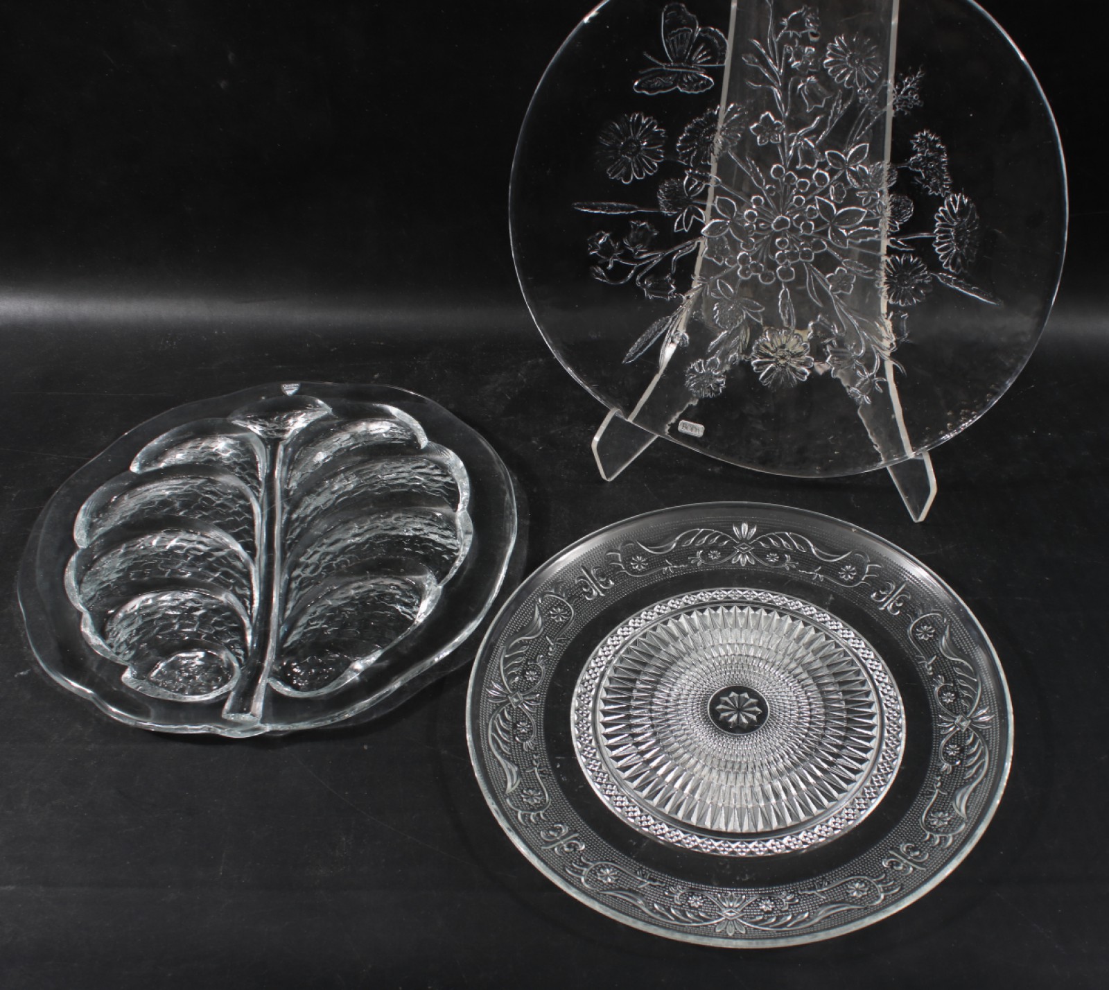 3 stycken, 1st Boda "Ulla", 1st Orrefors "Eden" samt 1st omärkt i pressglas, diameter 28,5-32 cm. (vån3)
