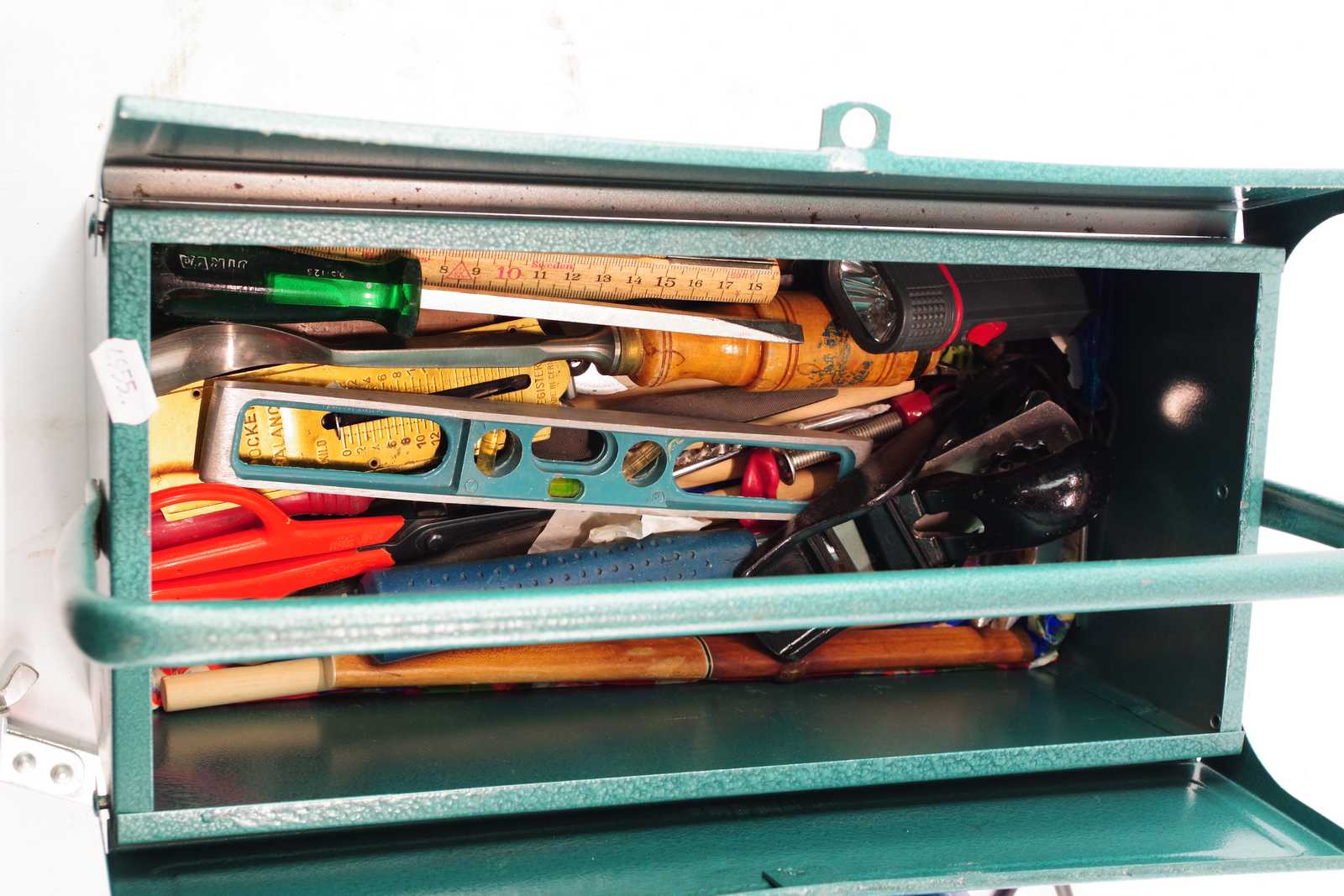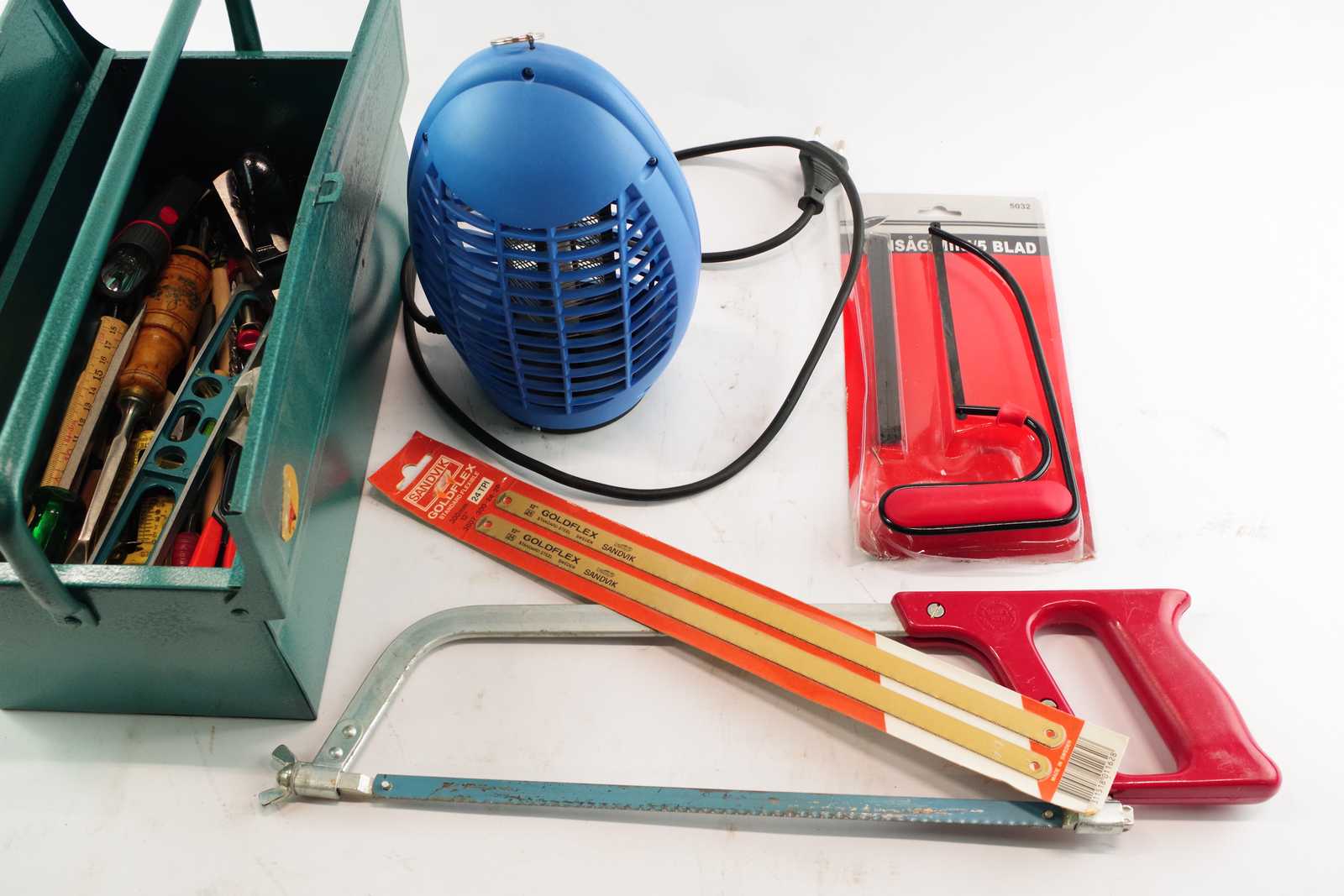 Bilder INSEKTSFÄLLA, VERKTYGSLÅDA plåt L:35 cm & diverse VERKTYG