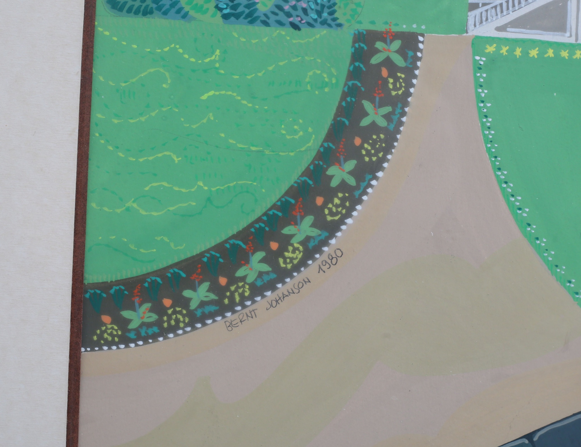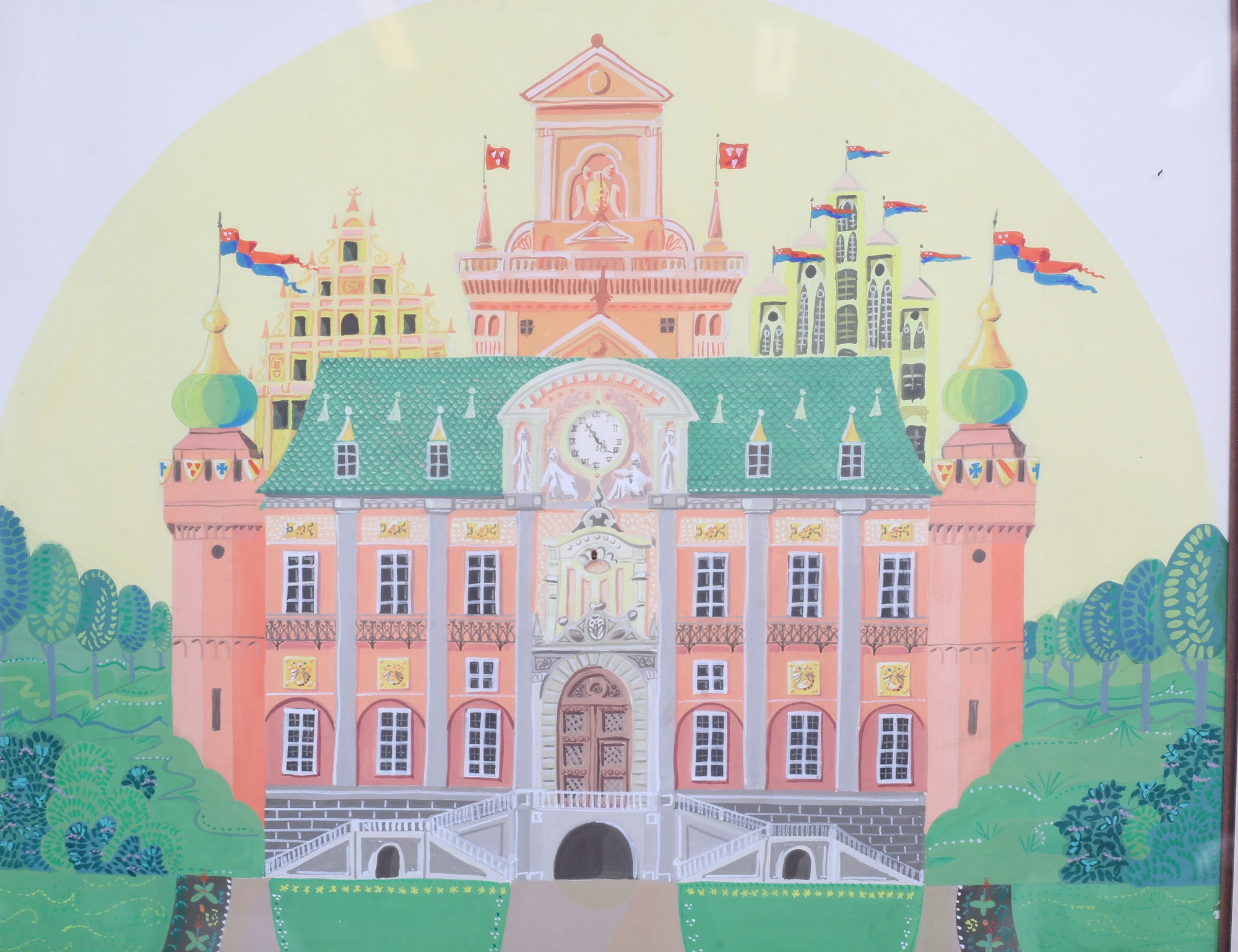 2 akvareller, fantasifull slottsbyggnad med fånge och drakar, 79/80 signerad, respektive flicka i yogaställning, 79/80 signerad, bildmått 55x39, rammått 71x51