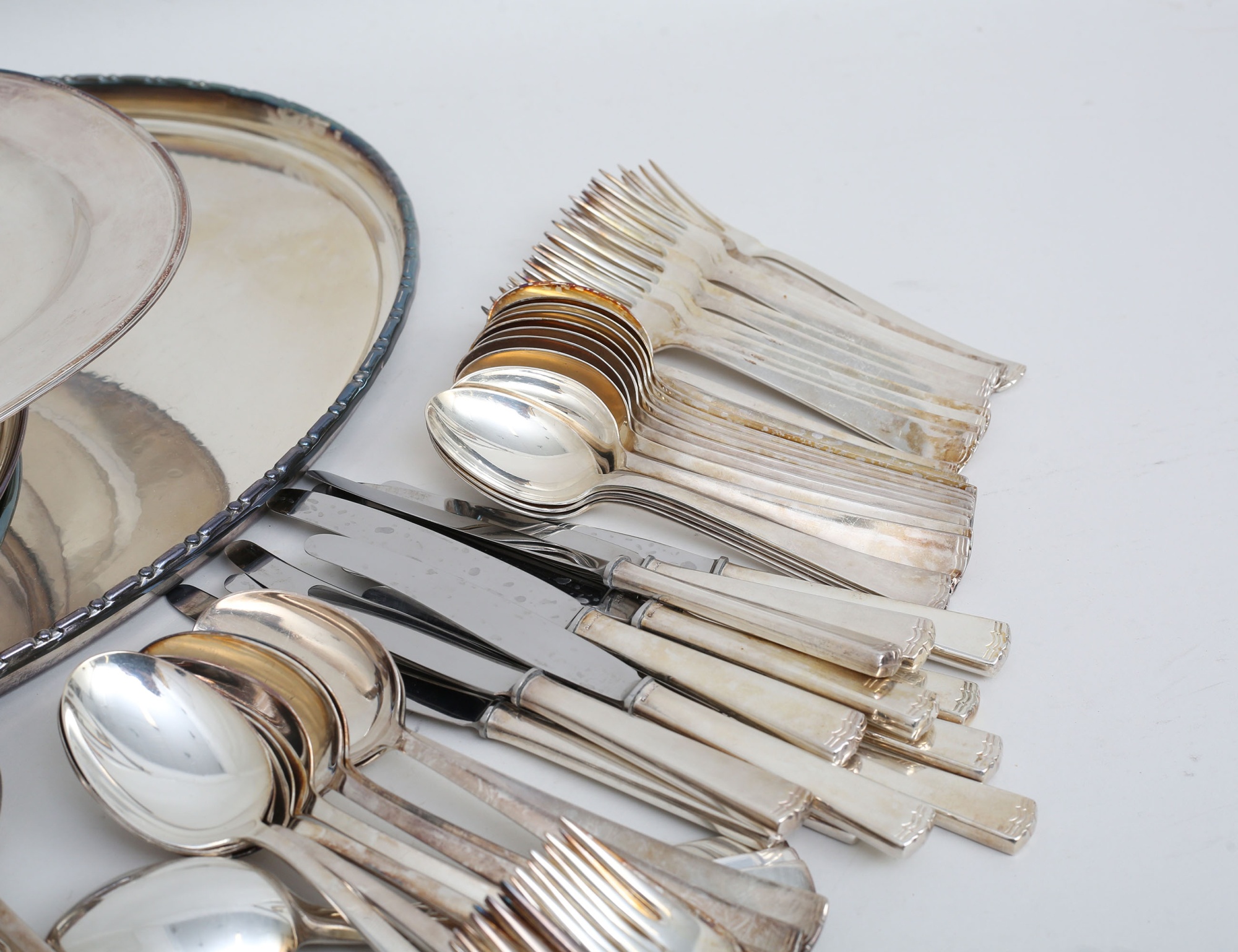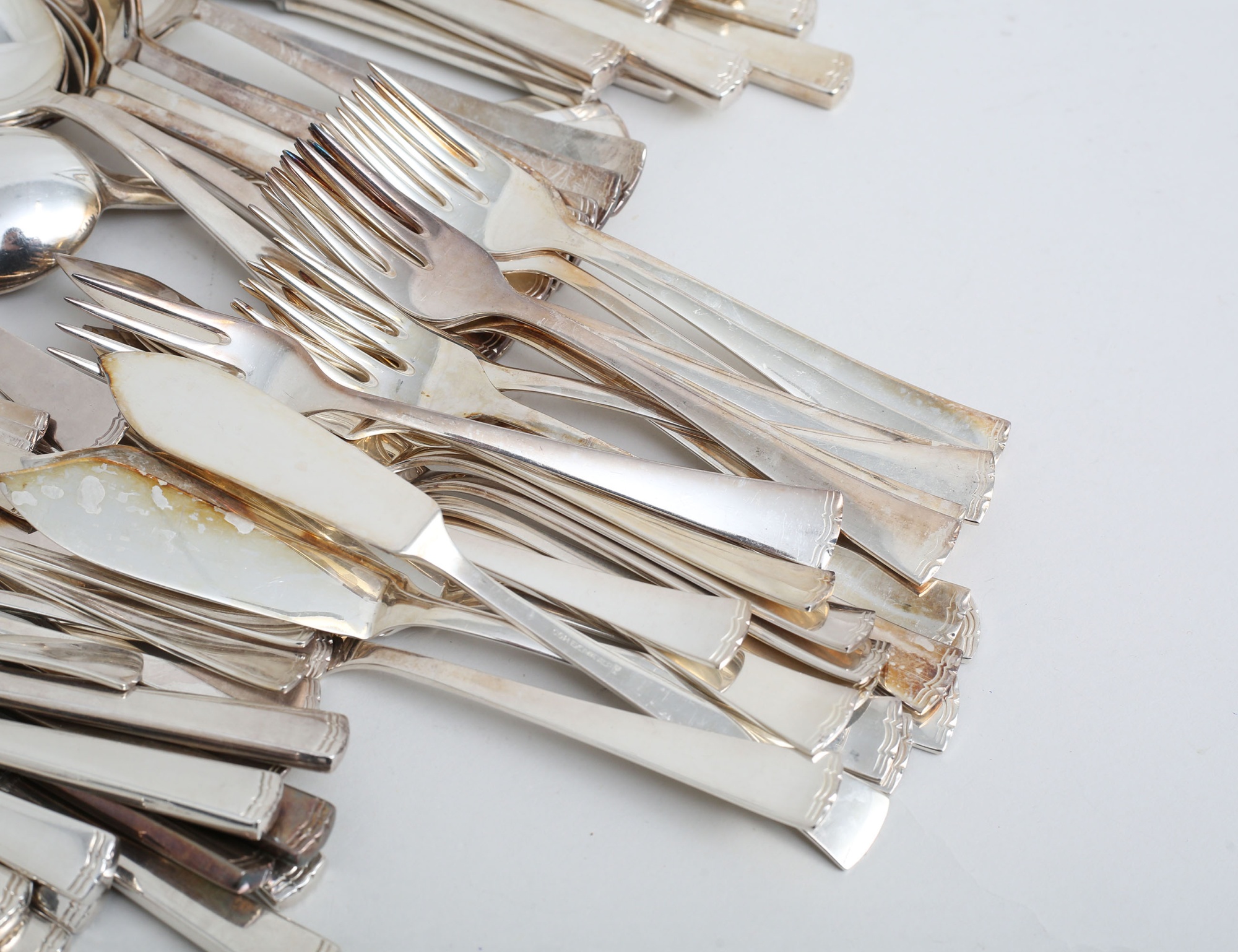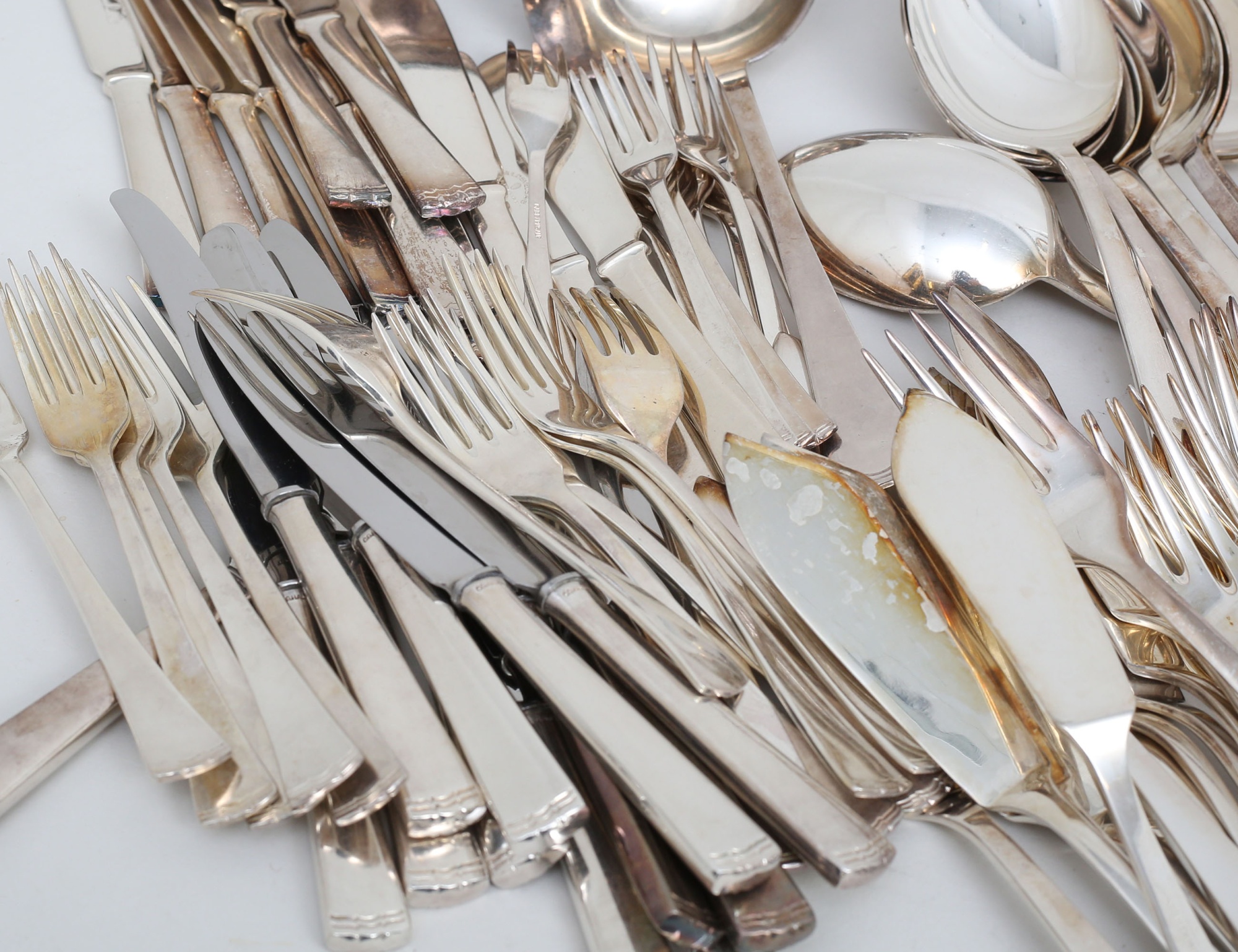 bestickuppsättning 118 delar, modell Diana, formgivare Gustaf Jansson CGH, hela dussin av fisk, bords, förrättsbestick och matskedar, m.m., ricka 50x35 och 3 fat