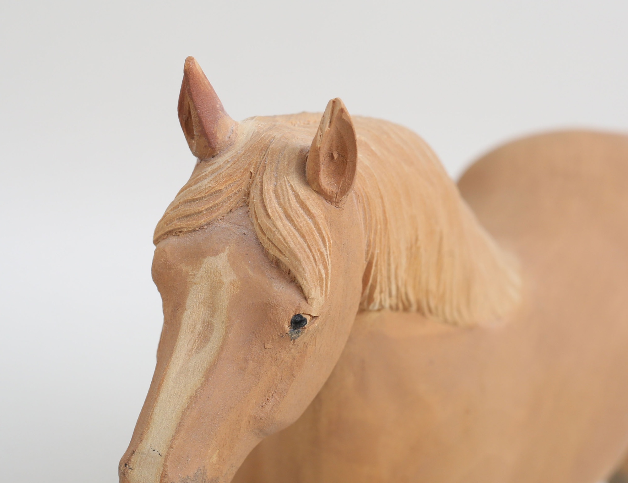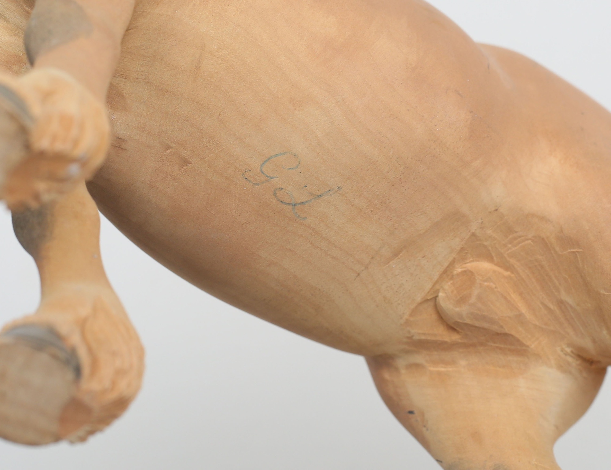 skulptur häst, träskuren, monogramsignerad, höjd 22, bredd 25 (ett öra med avslag)