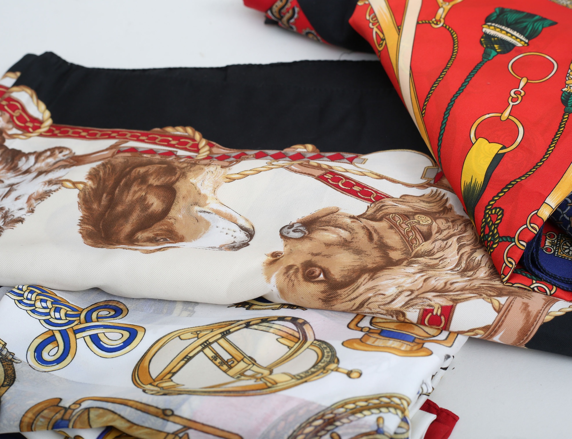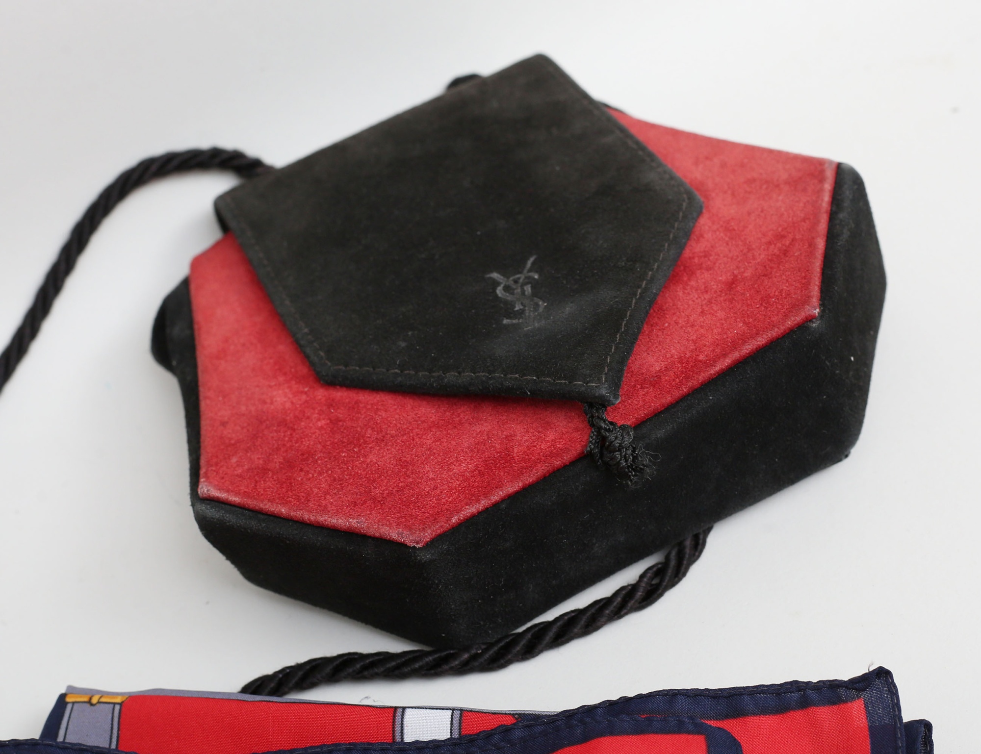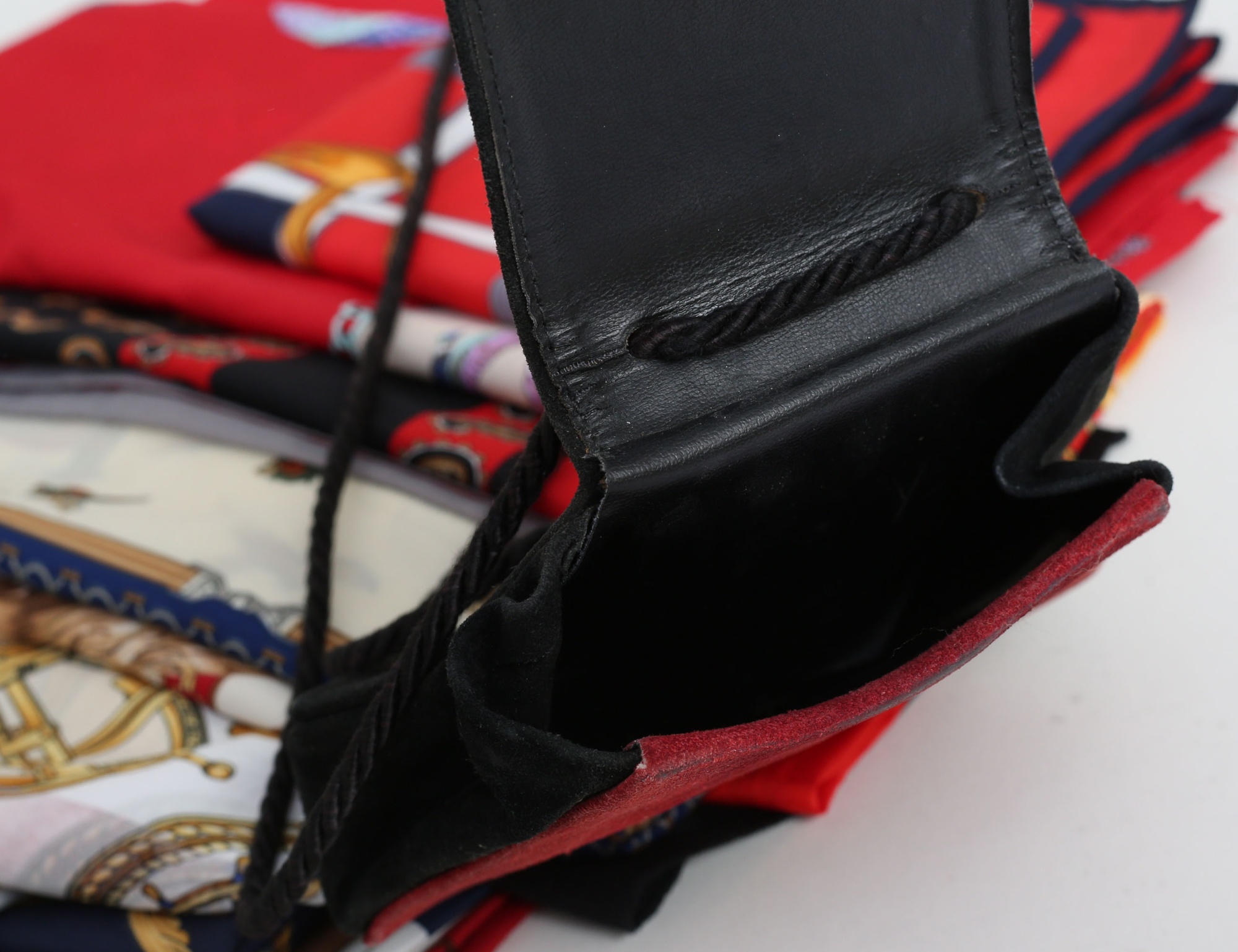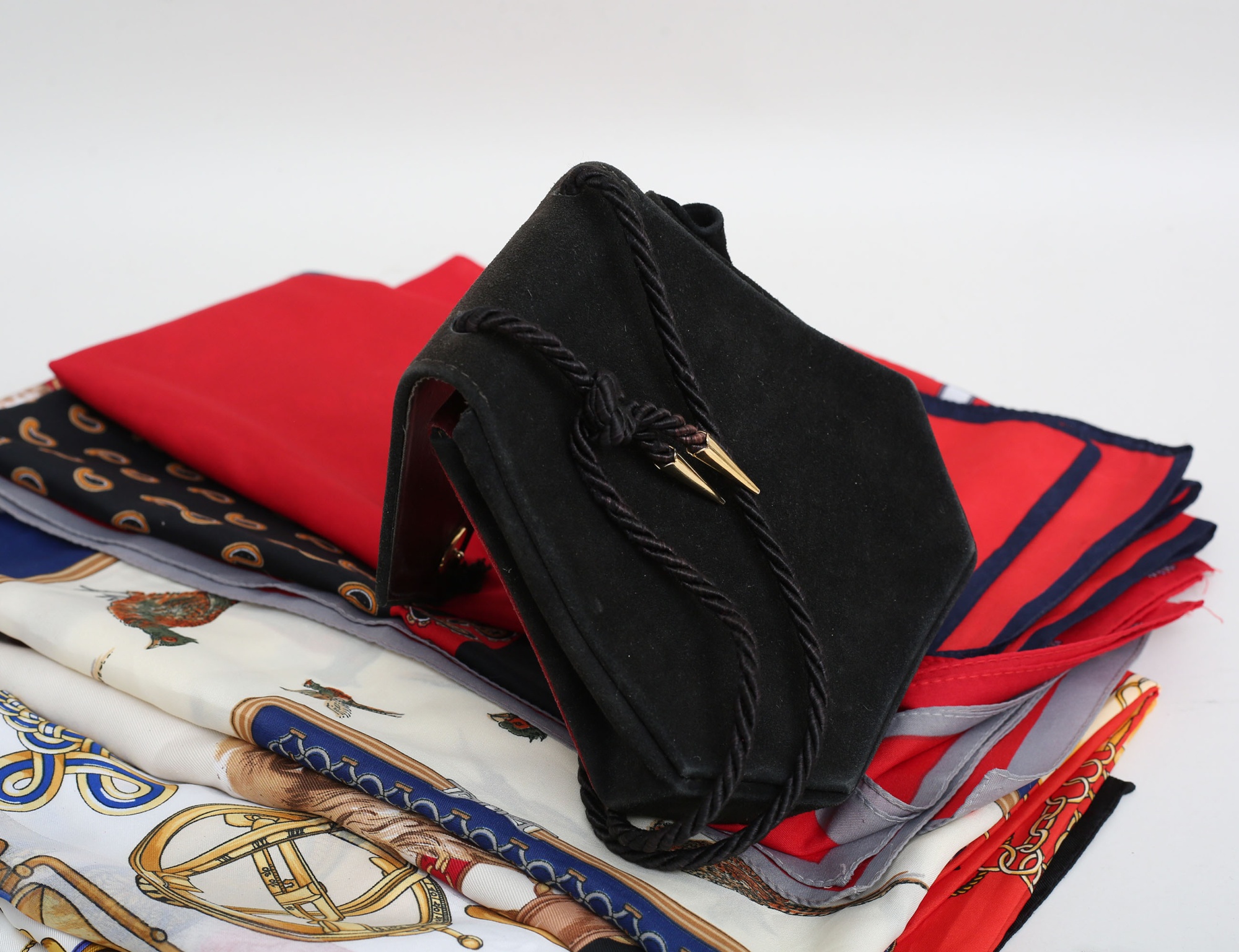 röd och svart mocka, tvinnad axelrem (bruksslitage, tofs saknas) samling scarves vintage, 13 stycken med olika motiv (14)