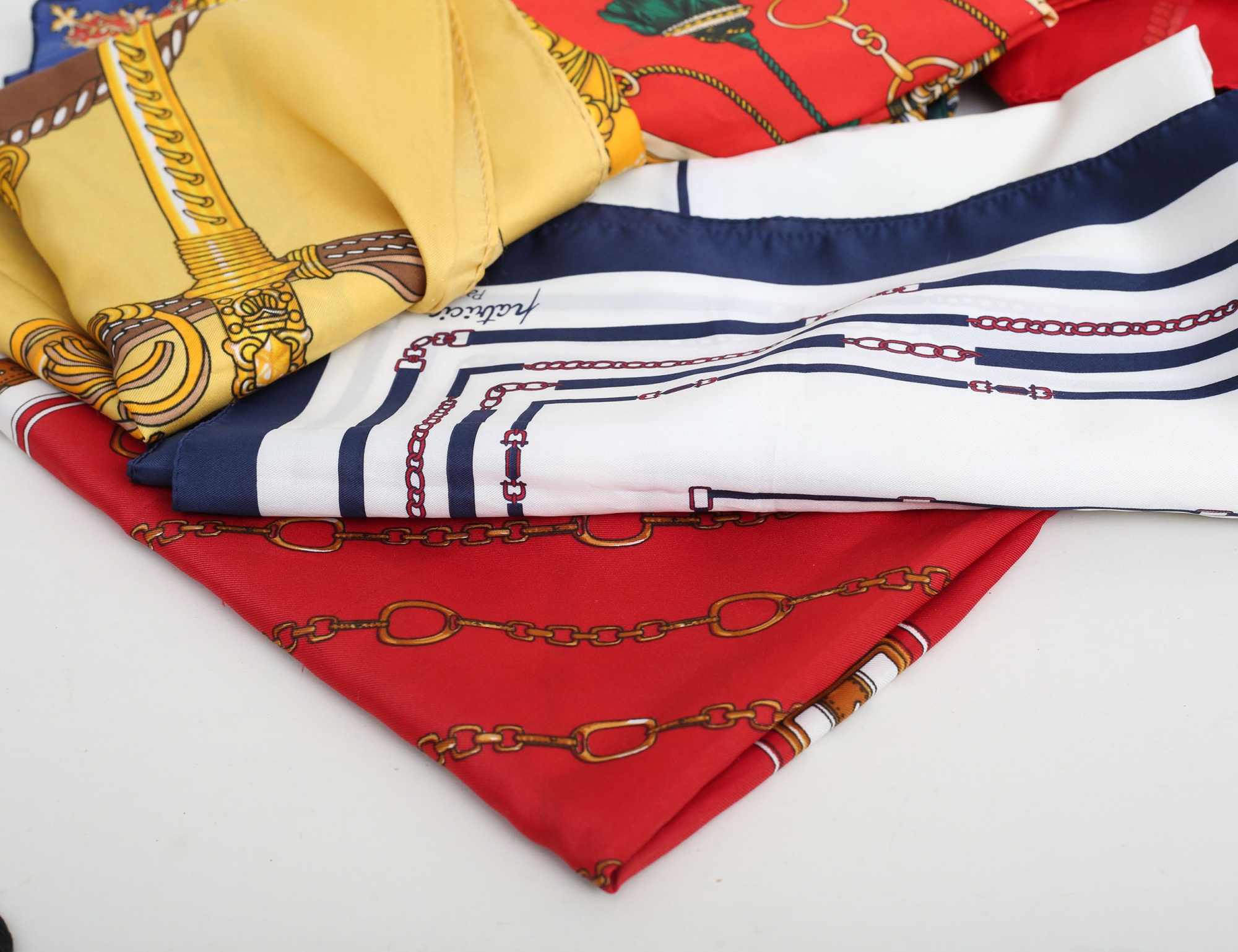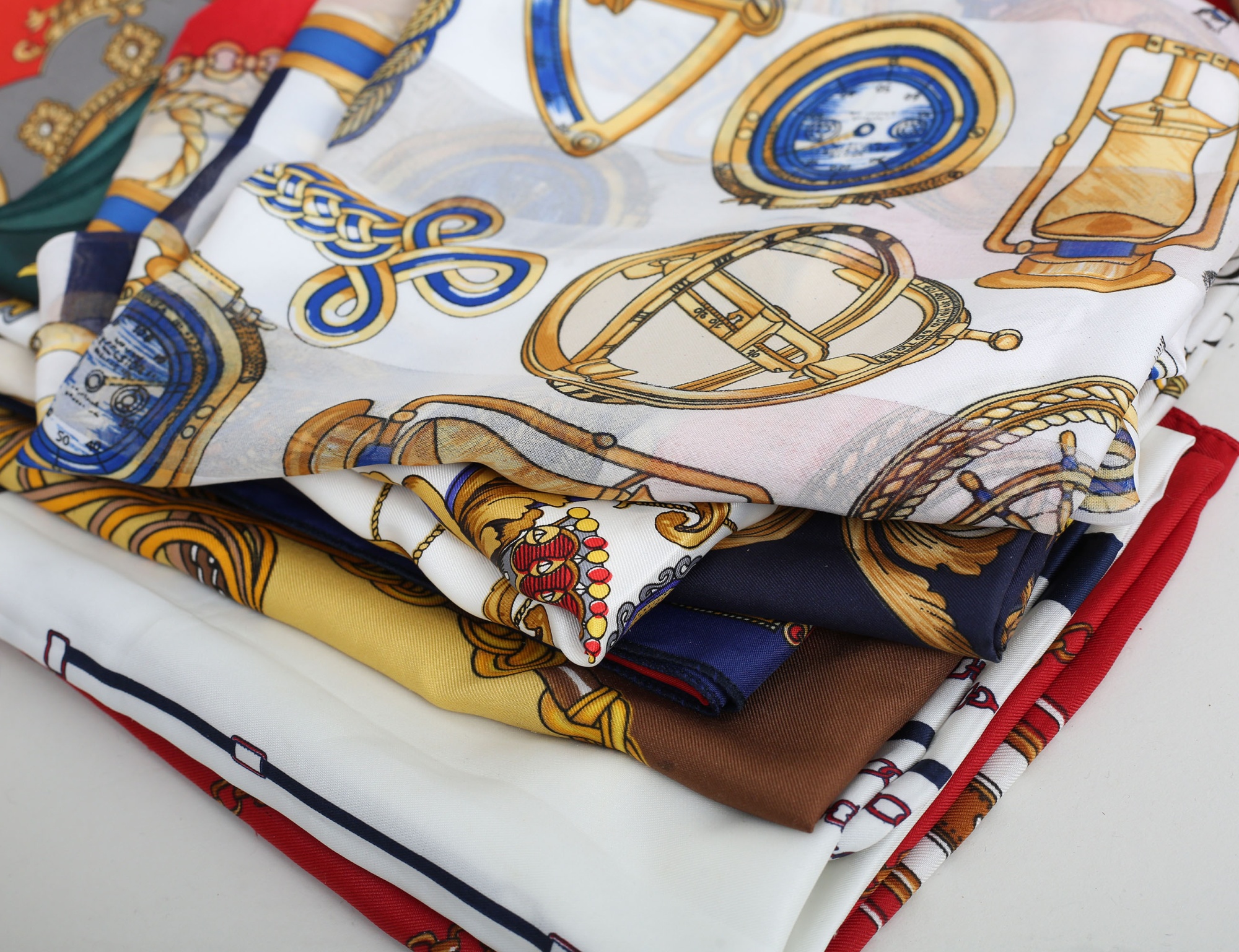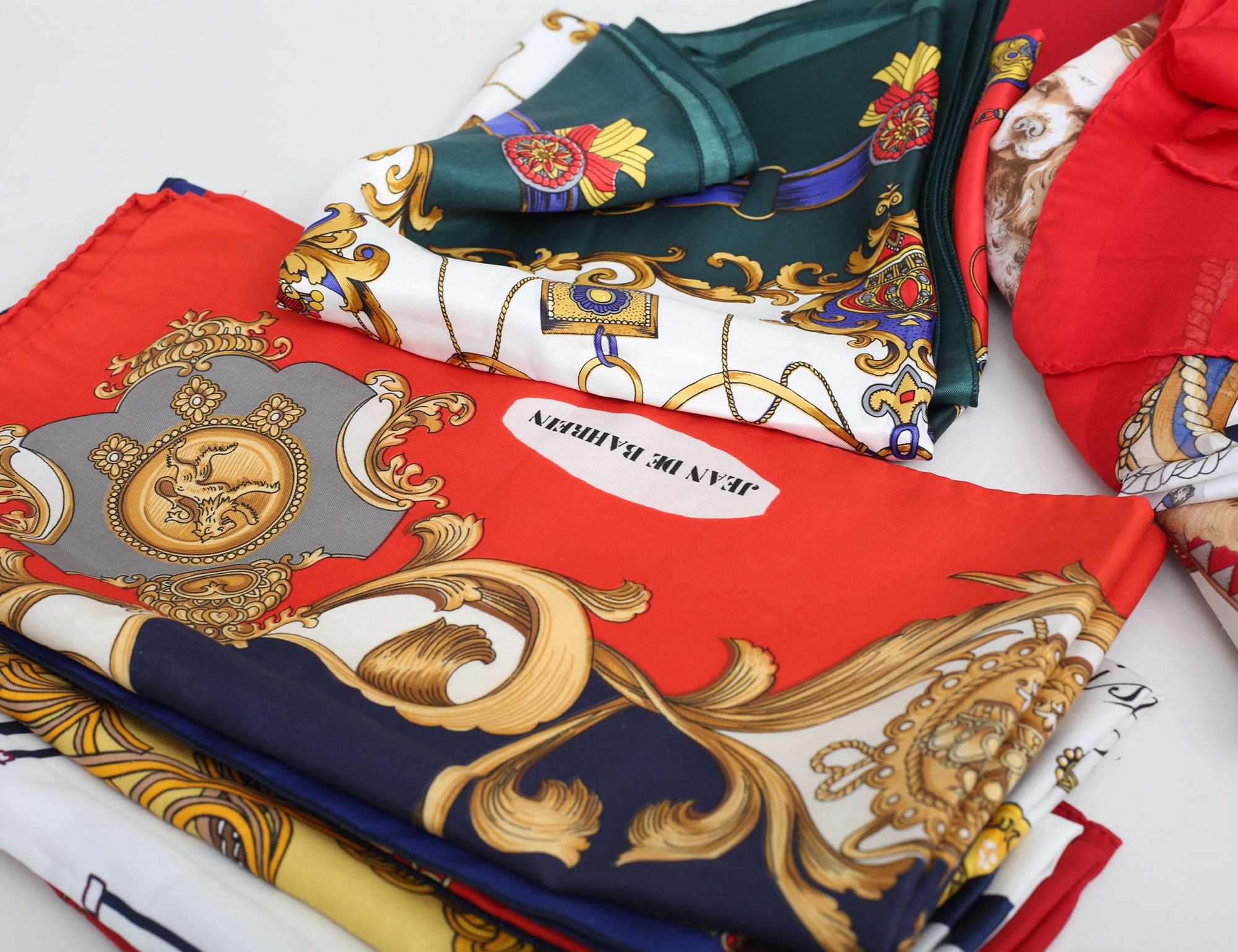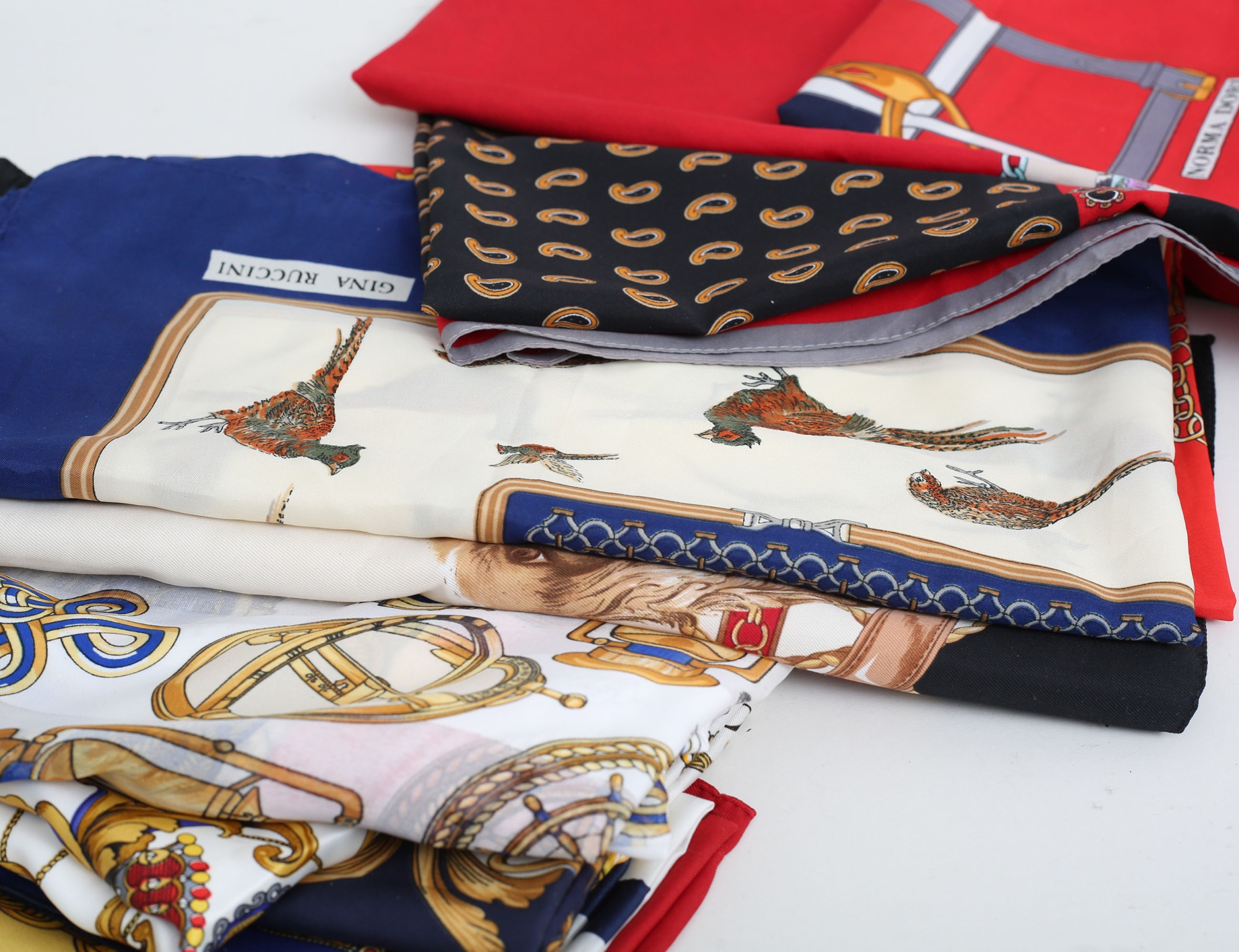 röd och svart mocka, tvinnad axelrem (bruksslitage, tofs saknas) samling scarves vintage, 13 stycken med olika motiv (14)