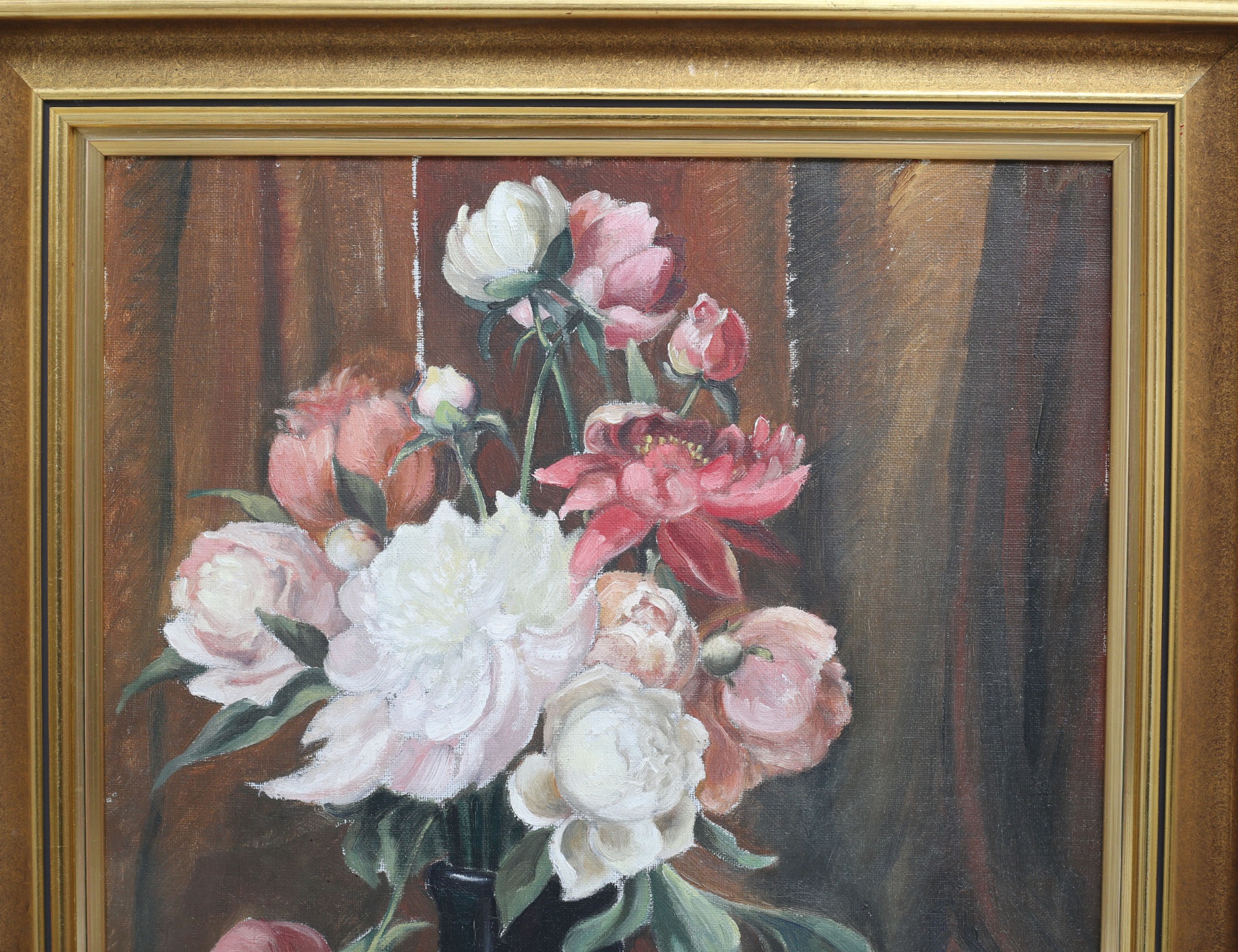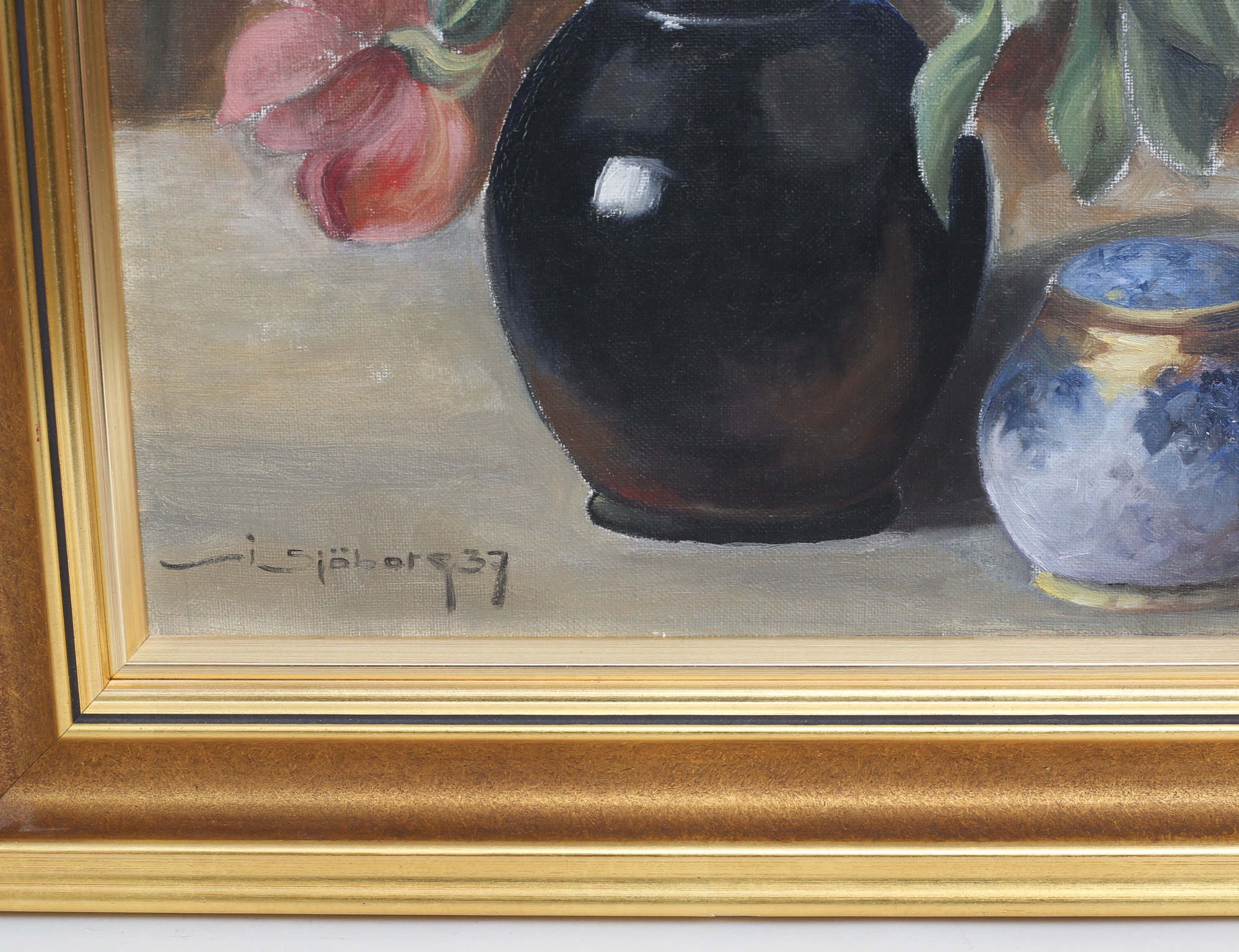 oljemålning på duk, "Pioner med ask", signerad -37, 48x38, rammått 60x50