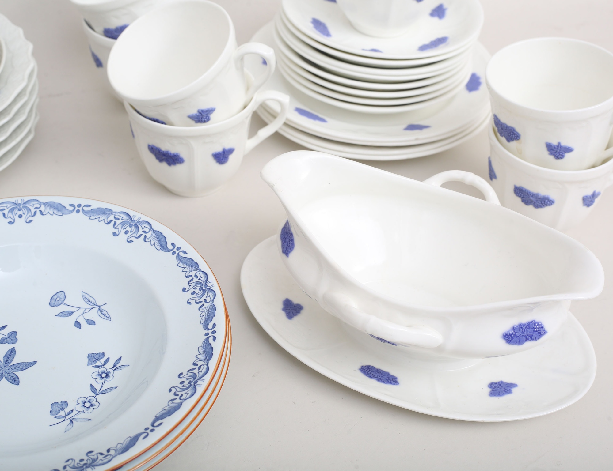 7 kaffekoppar med fat, 4 assietter samt såsskanna, 5 kaffekoppar med fat, samt 5 assietter - "Blå Blomster" Royal Copenhagen, 3 djupa tallrikar "Ostindia" Rörstrand, 3 kaffekoppar med fat "Wexiö Guld", Gustavsberg c.1900