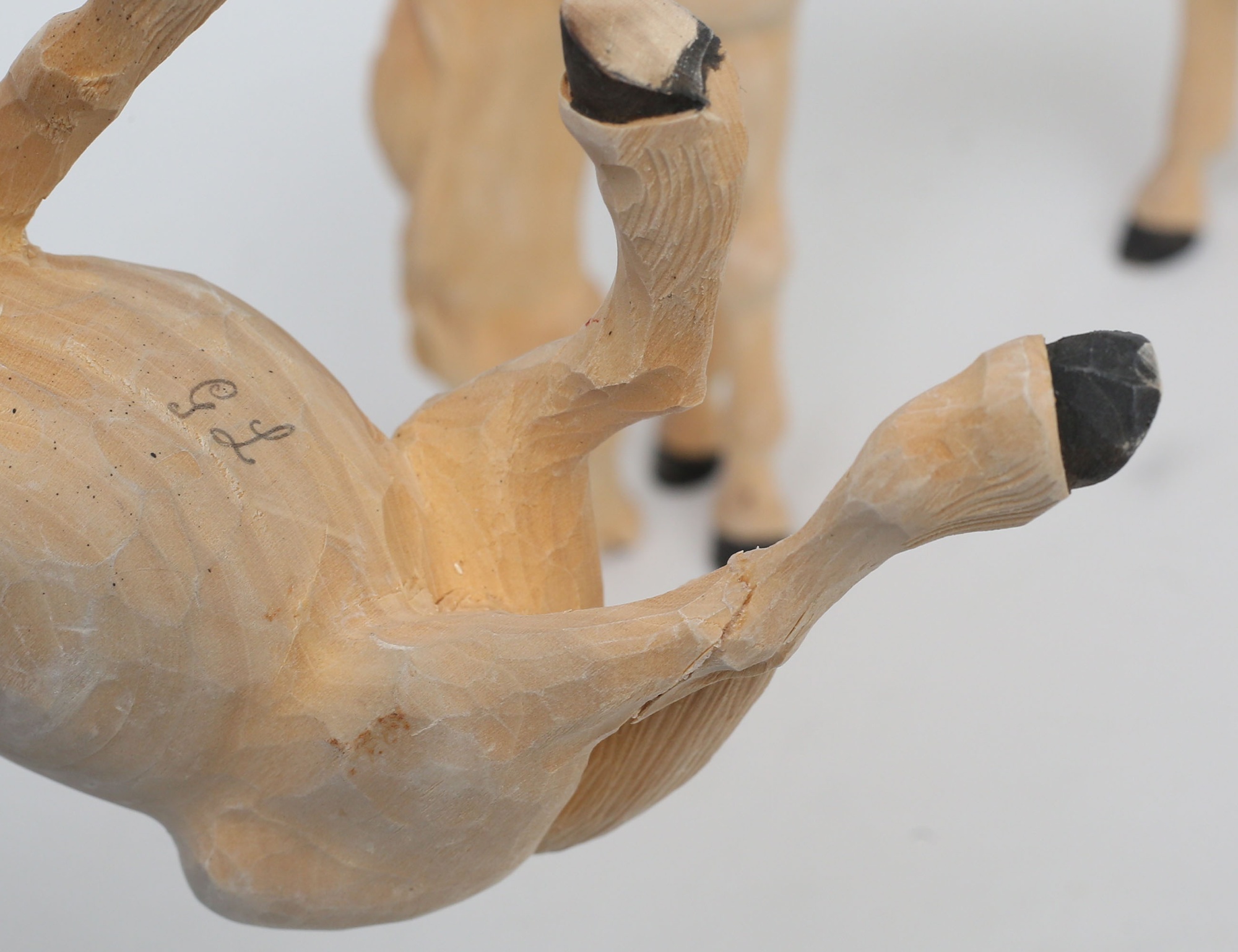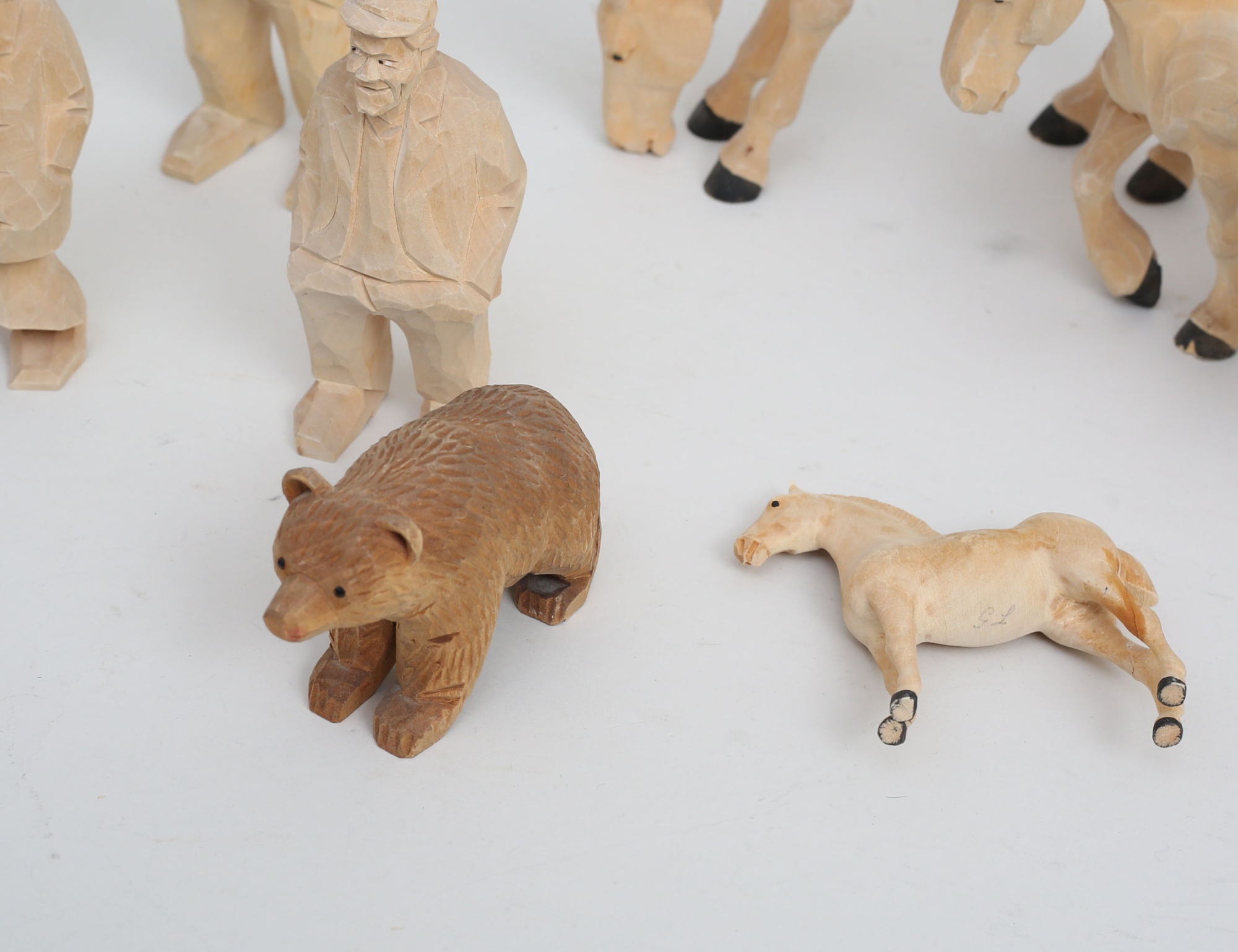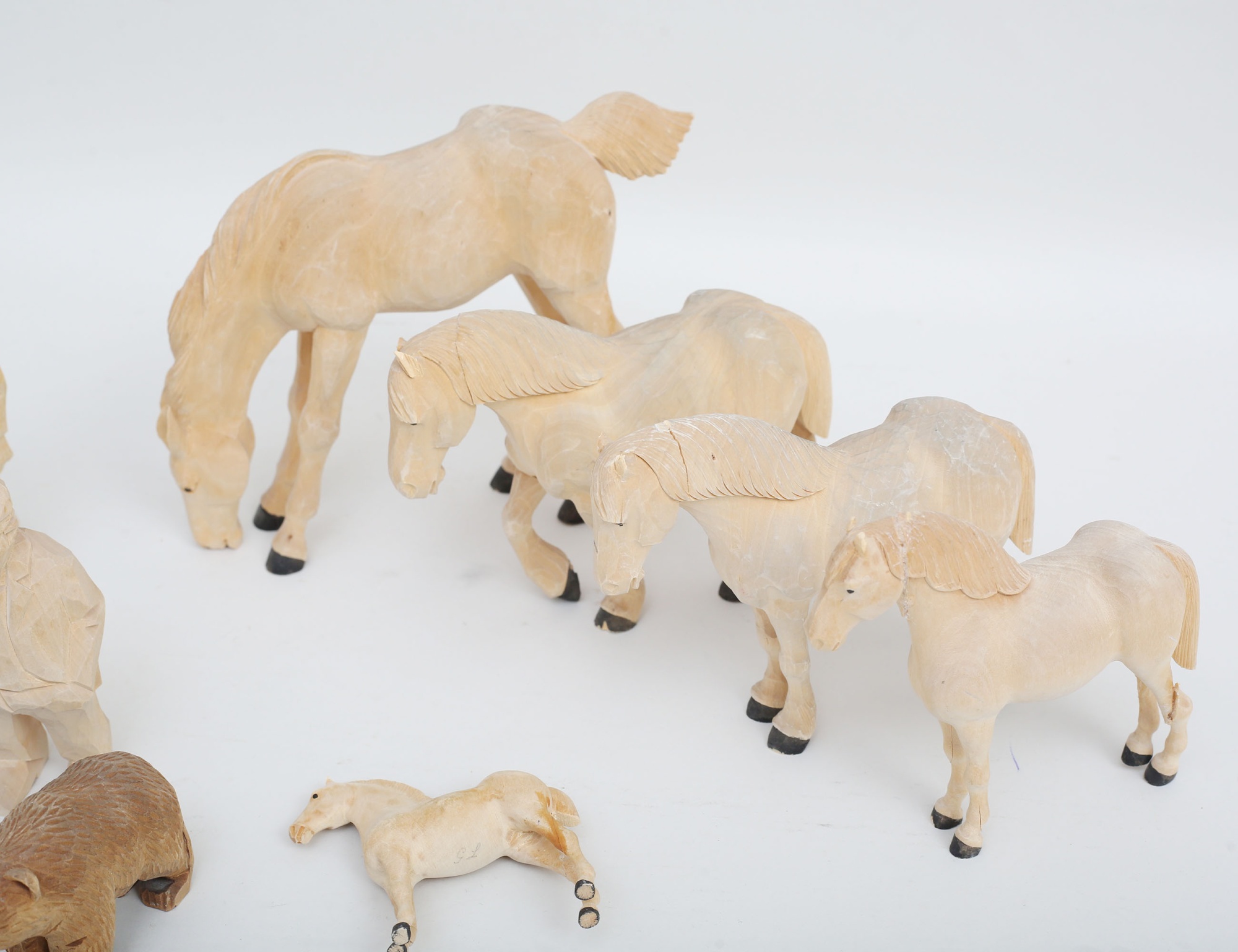 5 hästar av Gunnar Lunnevad, monogramsignerade , höjd 10-16 (samtliga med lagningar), 4 "gubbar" Nils Gunnarsson, monogramsignerade, höjd 12-17, björn signerad WH, höjd 7 (10)
