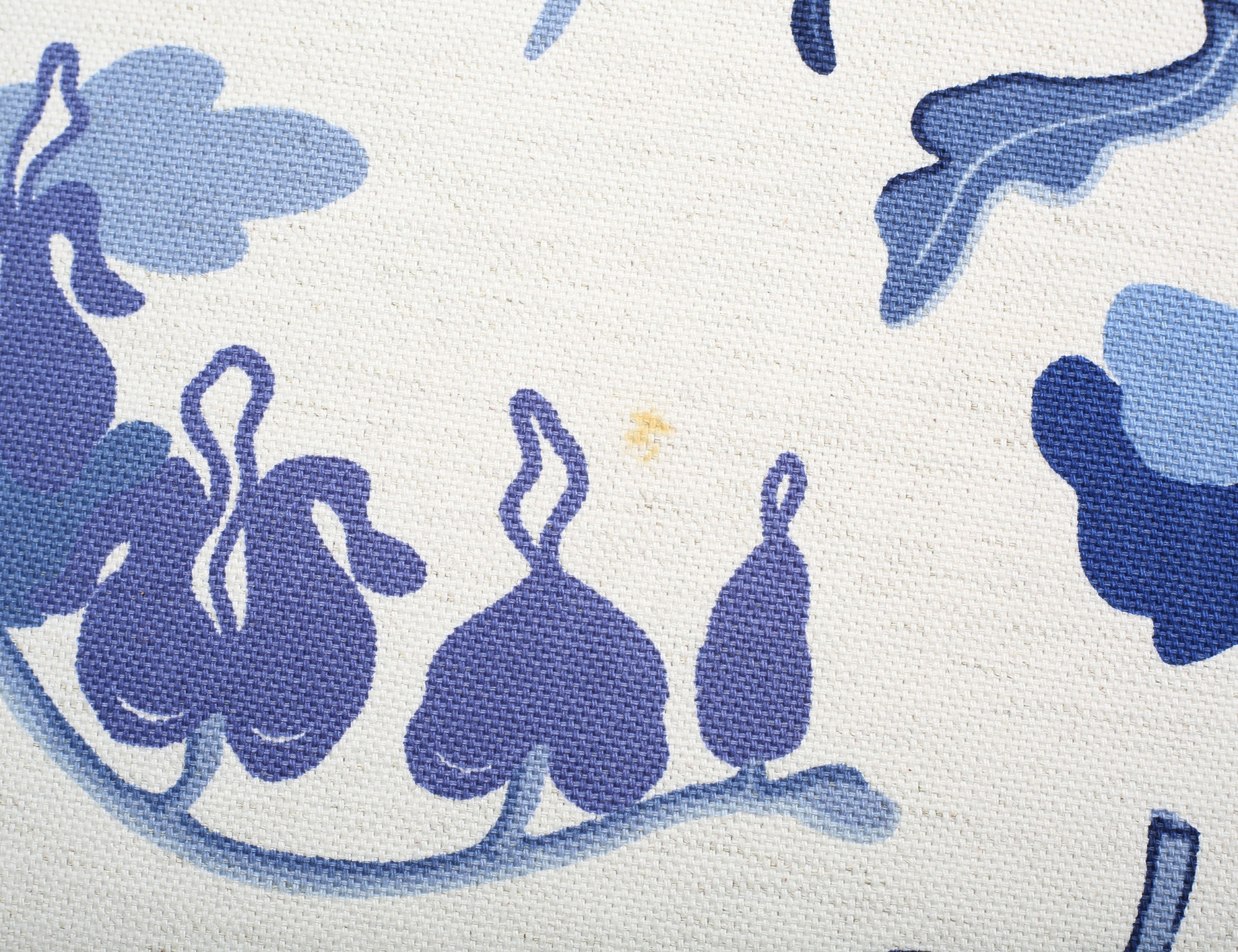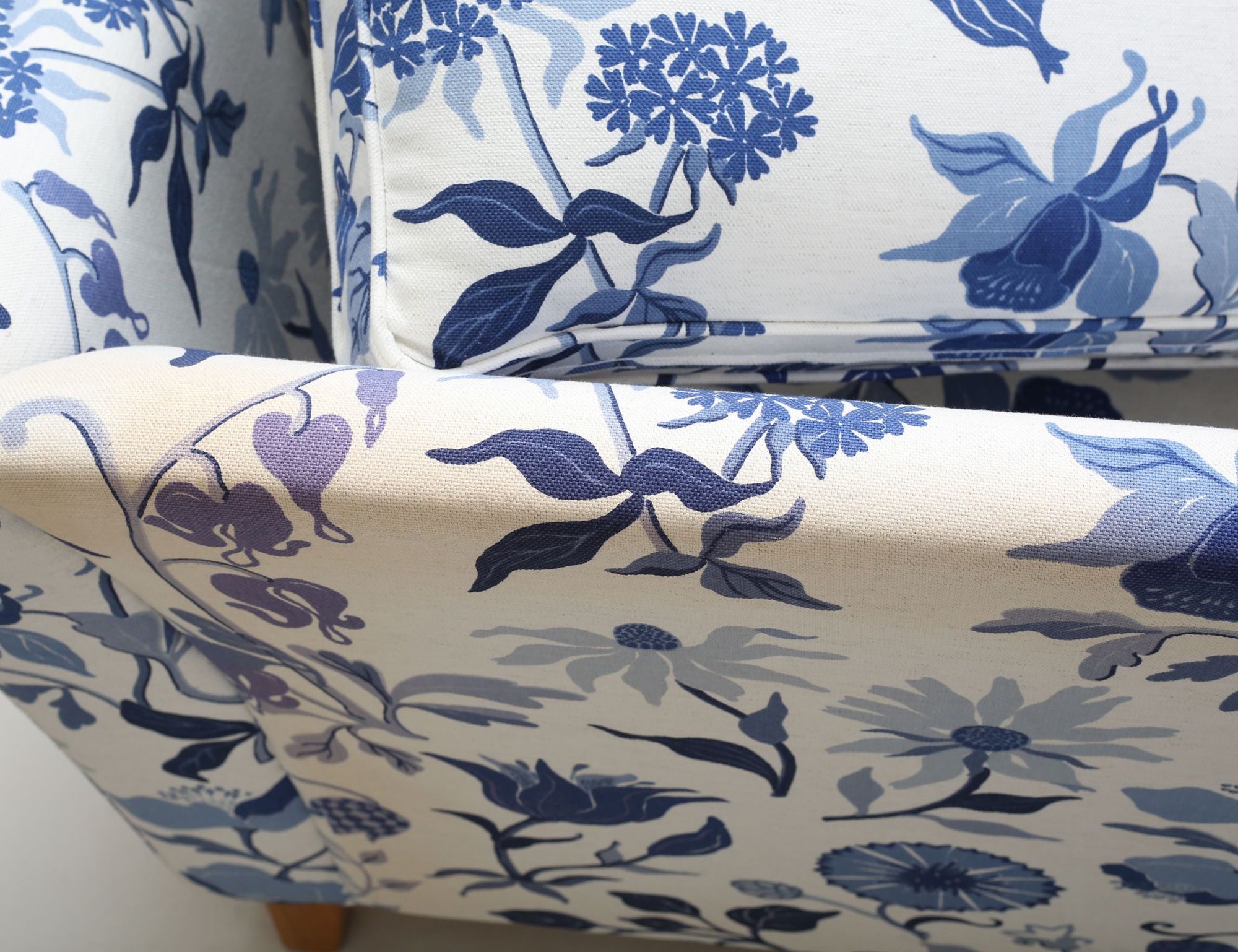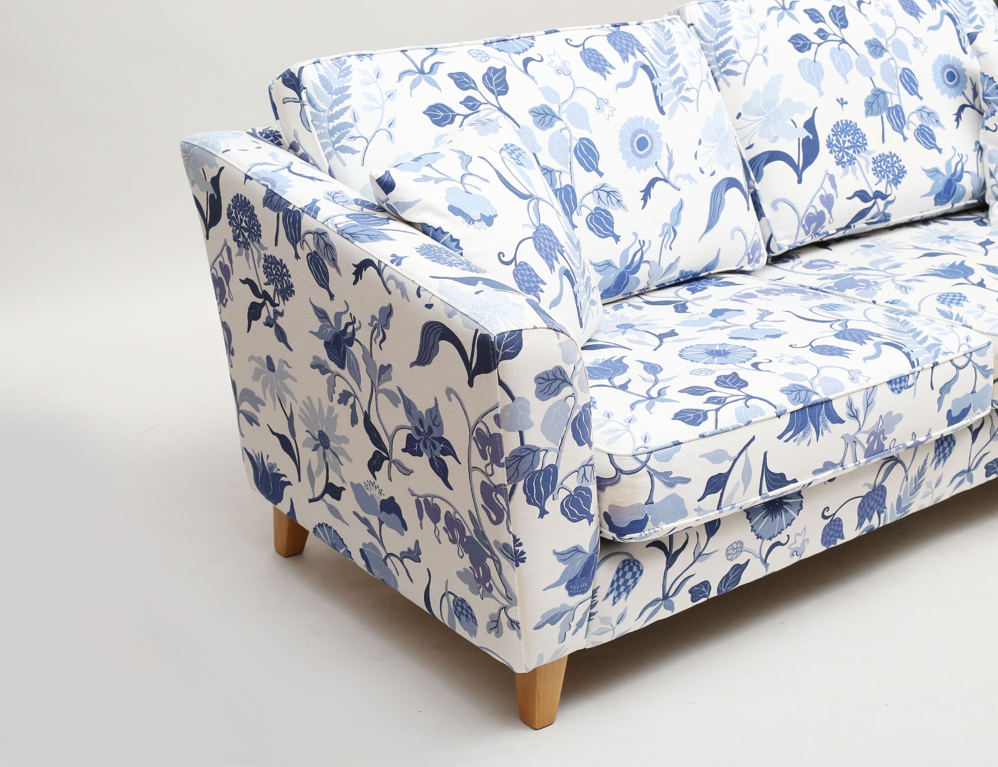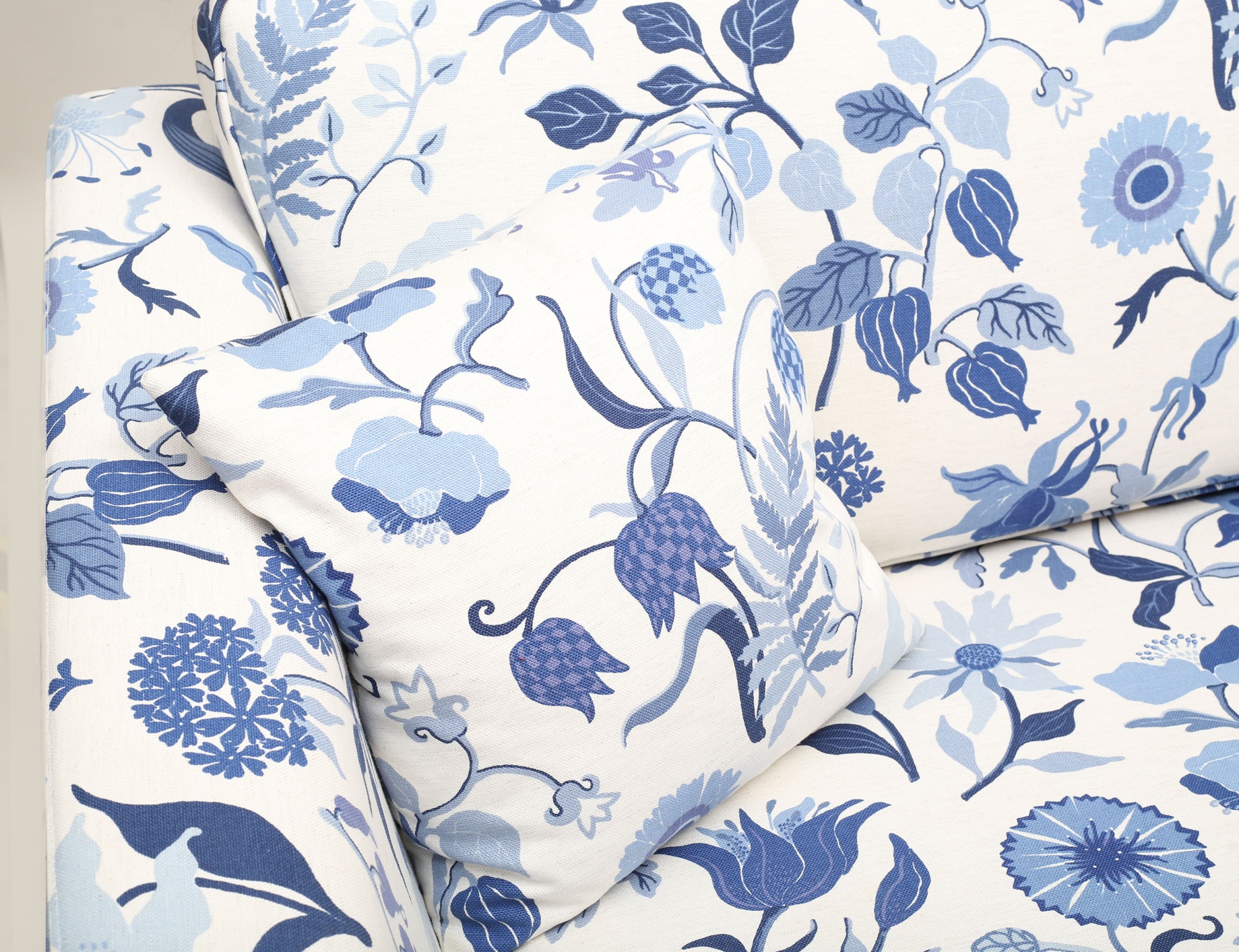Bröderna Andersson sent 1900-/2000-tal, mönstrad kretong, lösa plymåer, höjd 70, bredd 205, djup 87 (smärre fläckar)