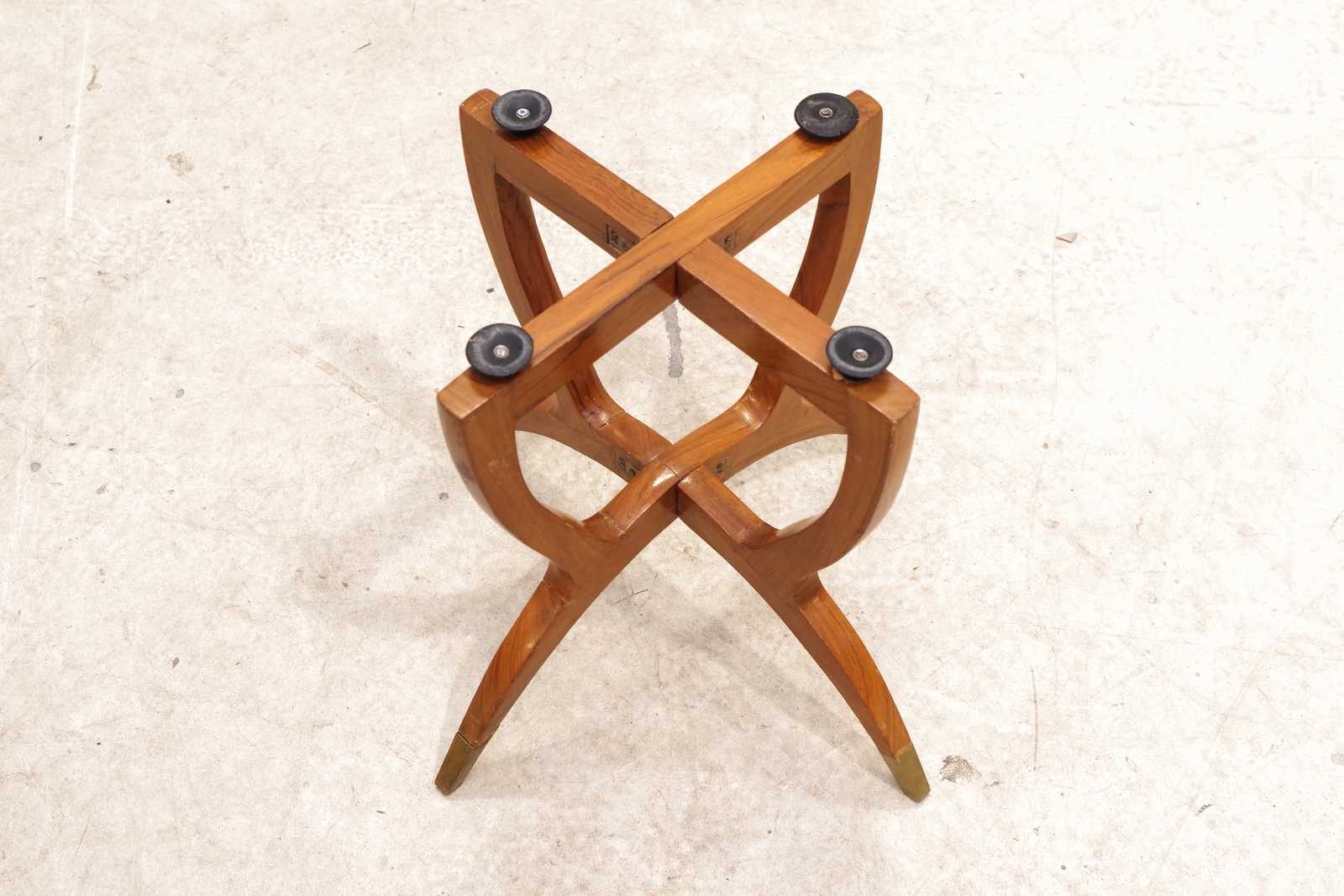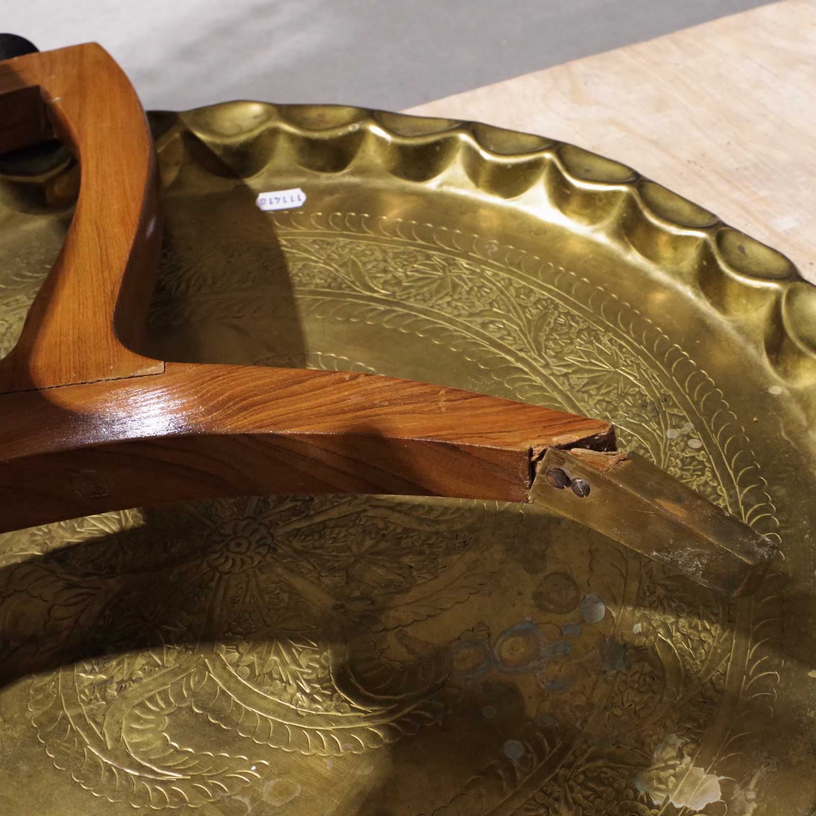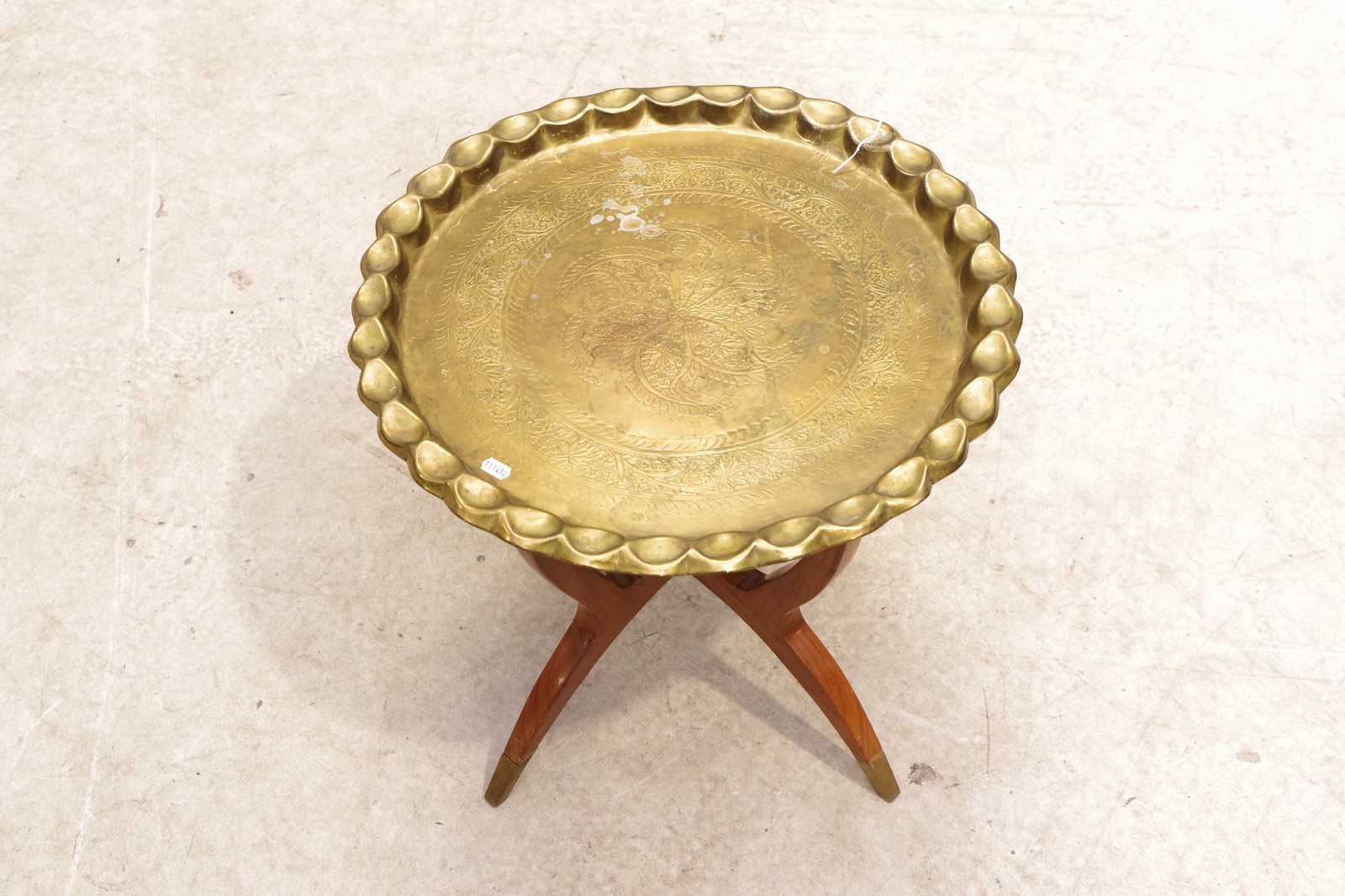 Bilder BRICKBORD hopfällbart 1900-tal, bricka av mässing. H:44cm Dia:50cm. OBS ena benet defekt.