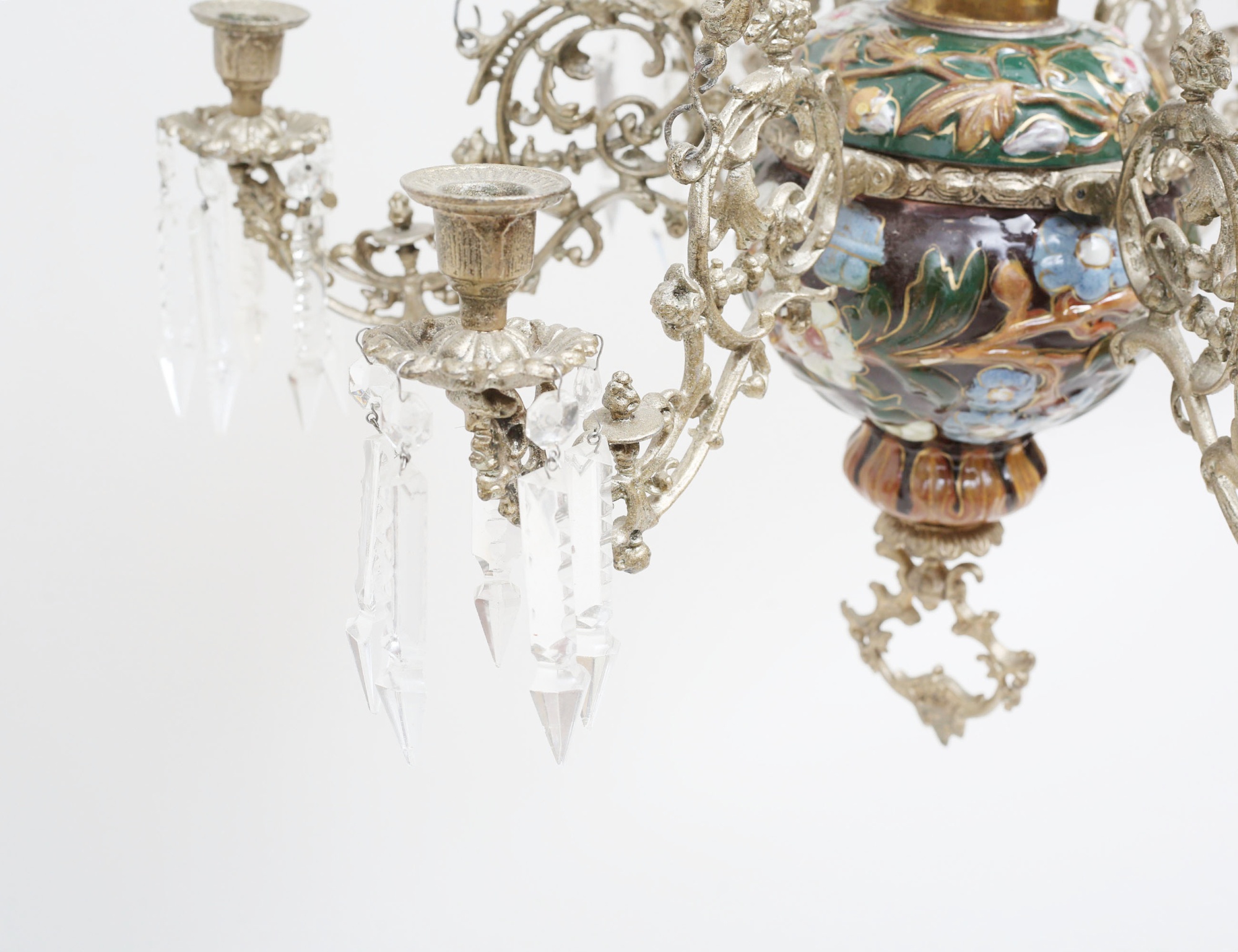 ornamenterad försilvrad stomme, för sex ljus, majolika, fasettslipade prismor, delvis matterad glaskupa, höjd ca. 120
