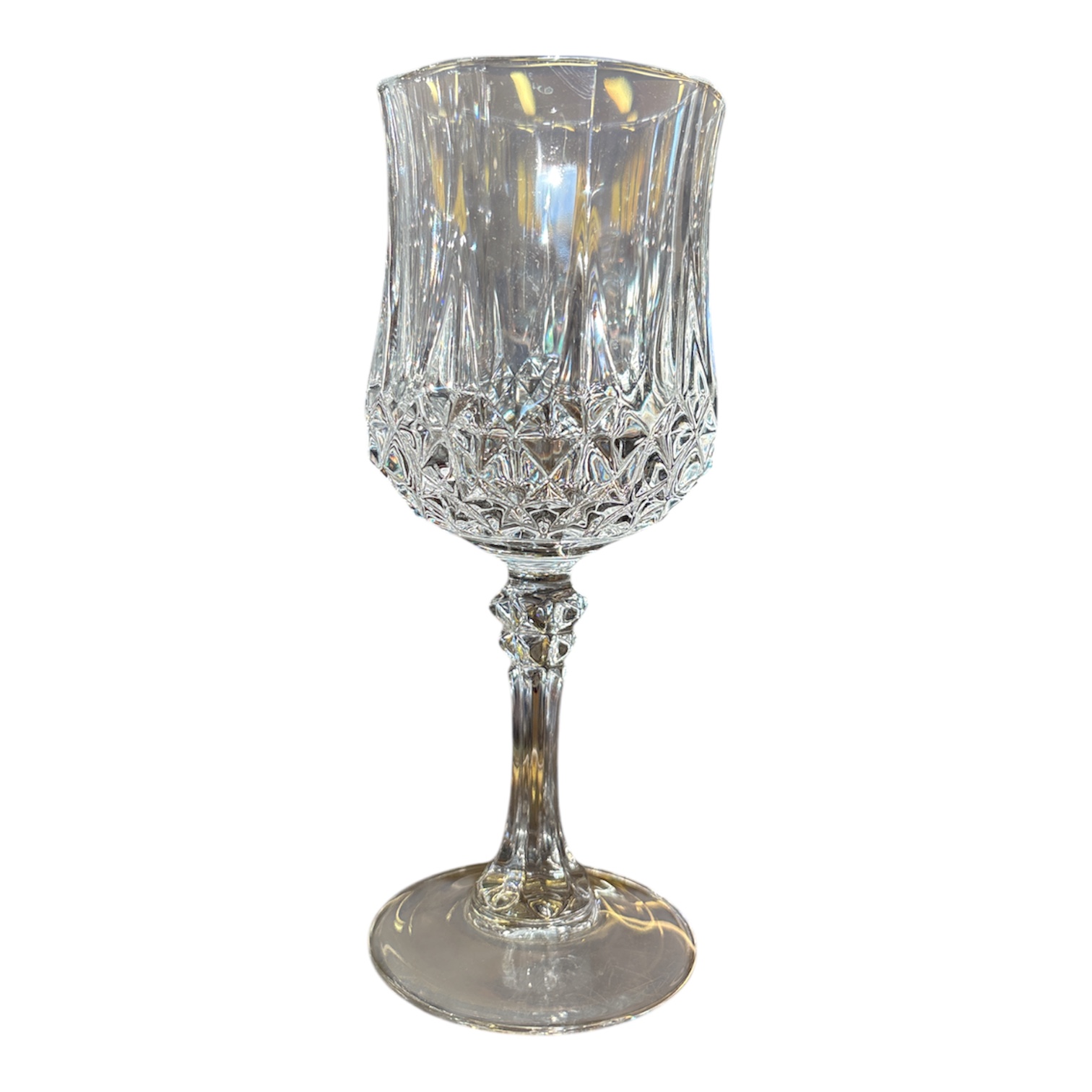 Set om 9 stycken slipade glas på fot, utförda i klart glas/kristall med klassisk slipad dekor. Glasen har en elegant kupa med rut- och facetslipning samt dekorativ fot, typisk för andra hälften av 1900-talet.