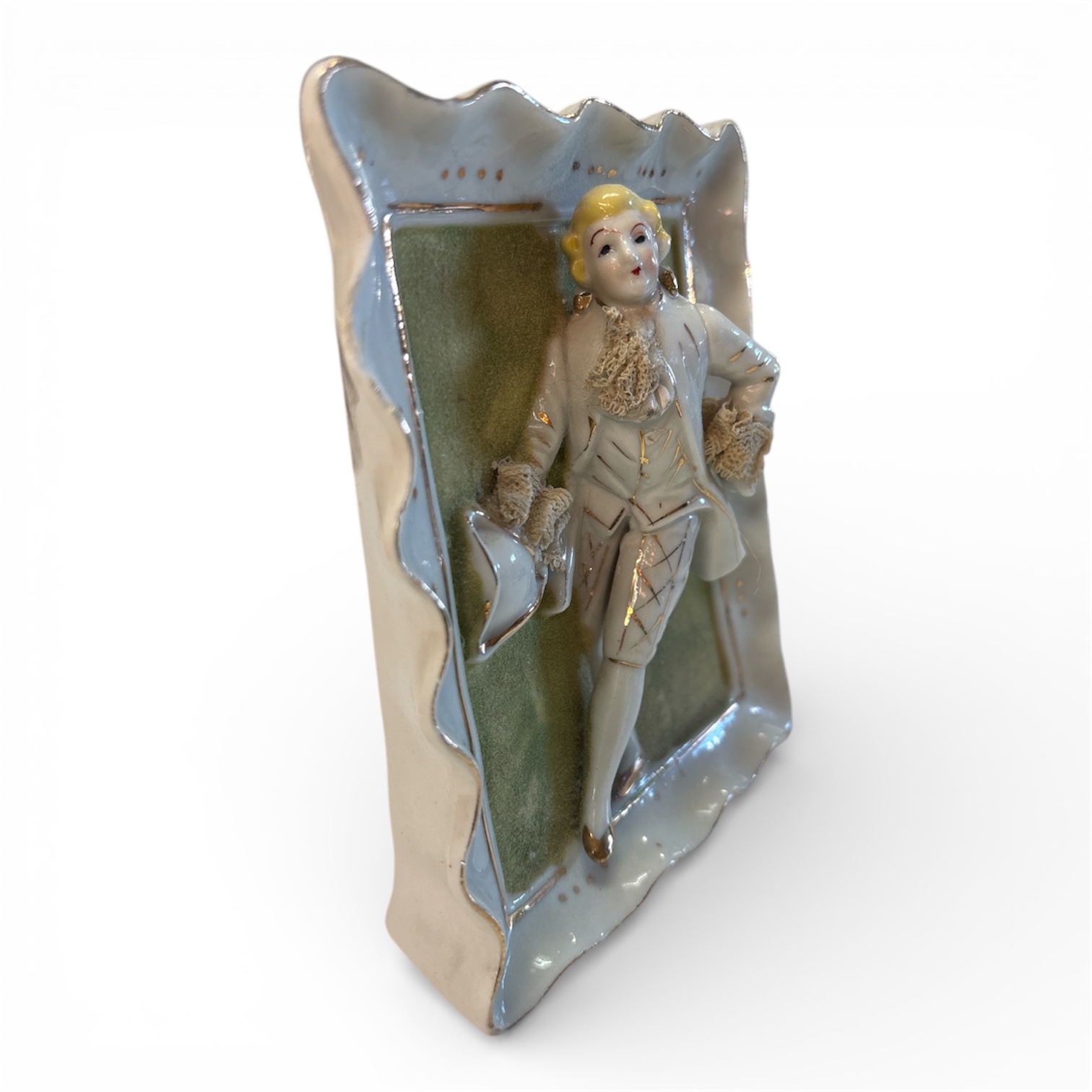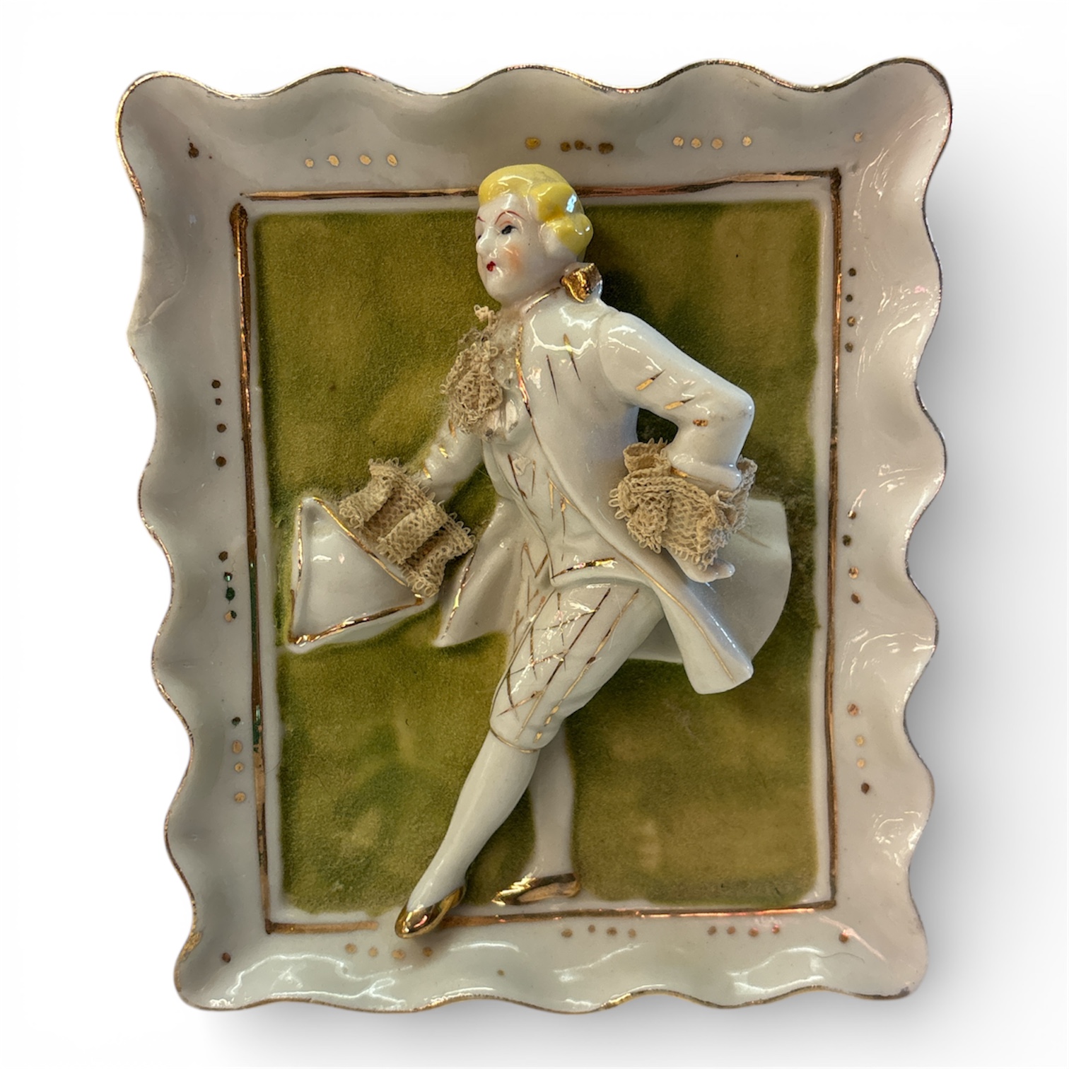 Dekorativ porslinsplakett i relief, utförd i rokokoinspirerad stil, föreställande en elegant figur i rörelse, klädd i tidstypisk dräkt och hållande hatt. Kompositionen präglas av mjuka linjer, livfull hållning och omsorgsfullt modellerade detaljer. Plaketten har en vågformad ram, grön fond samt förgyllda accenter som förstärker det dekorativa uttrycket.