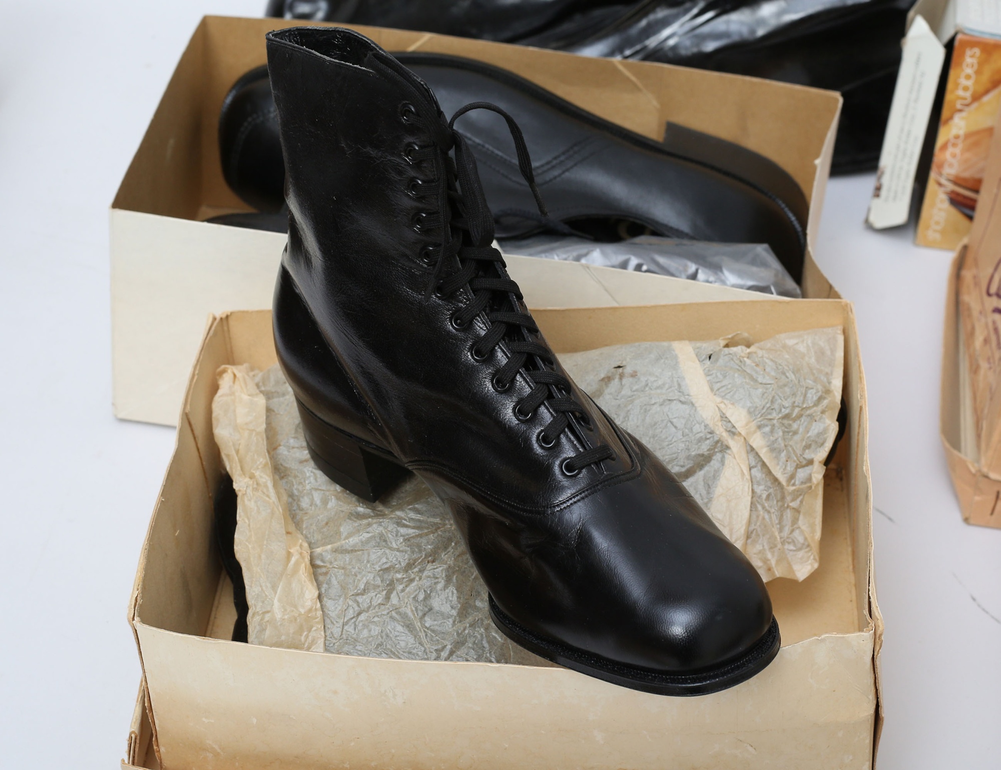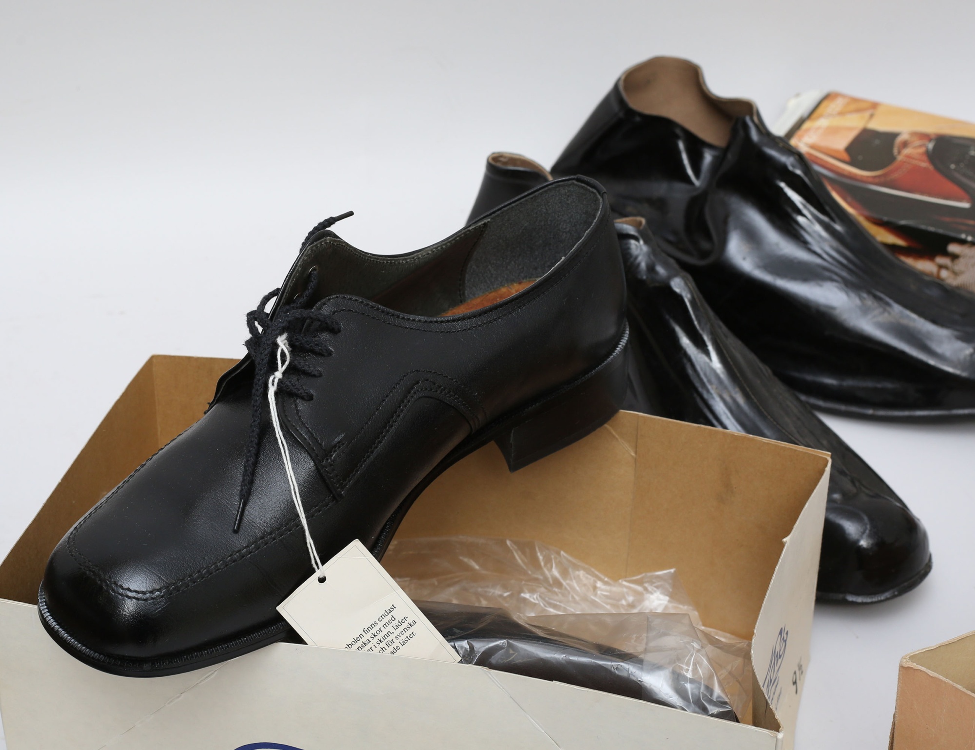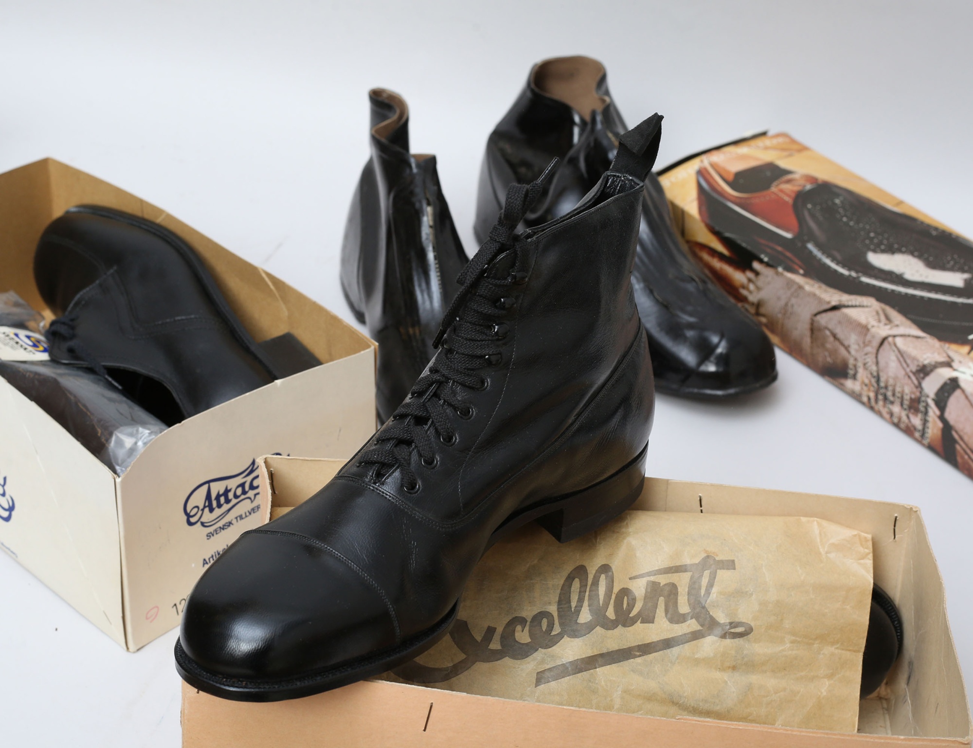 1 par dam storlek 38, 1 par dam storlek 39, ett par herr storlek 43, originalkartonger, Vänersborg/Excellent, 1 par herrskor och 2 par galoscher medföljer