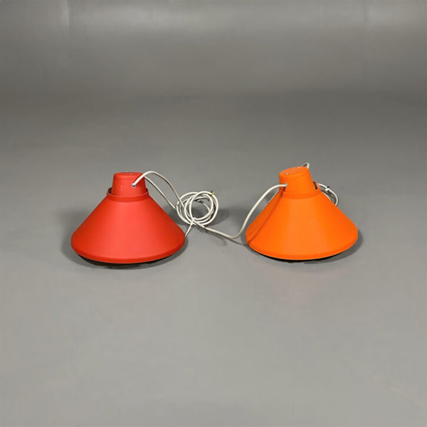 Taklampa från Zero, modell Shibuya formgiven av Thomas Bernstrand 2014. Denna unika ljuskälla i orange/röd ger ett stilrent intryck med sina två seriekopplade enheter.