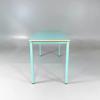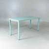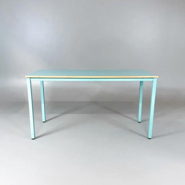 Bord med rektangulär bordsskiva i turkos laminat med träkant. Lackerat metallstativ i matchande turkos färg.
