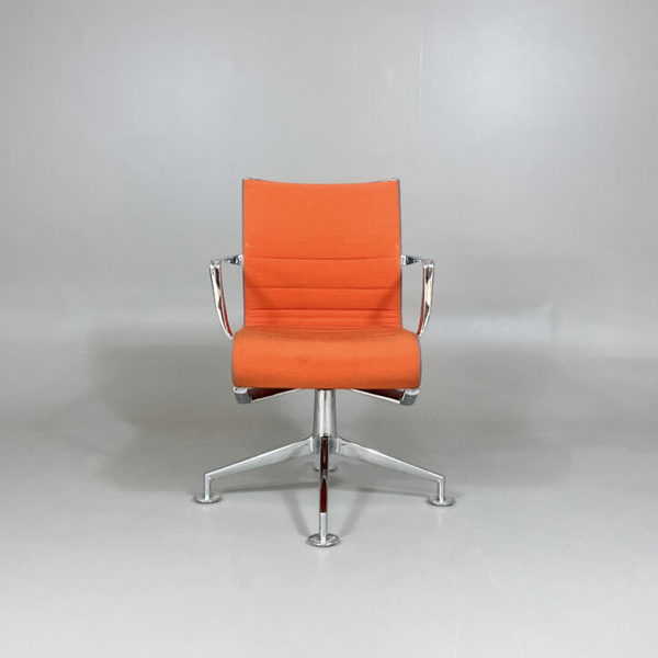 Arbetsstol från italienska Alias. Modellen heter Meetingframe och är designad av Alberto Meda. Rygg och sits är i orange tyg och stommen är i kromat aluminium.