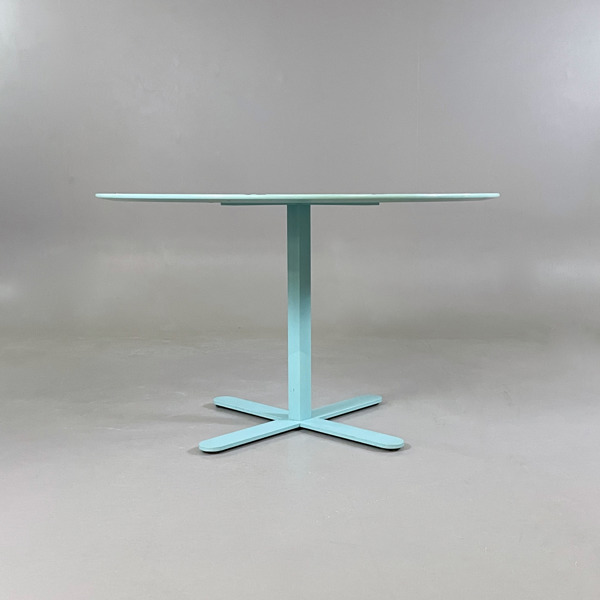 Matbord från Montana, modell "Multi Table" formgiven av Peter & Joakim Lassen. Toppskiva i trä, stativ i stål. Fasad kant.