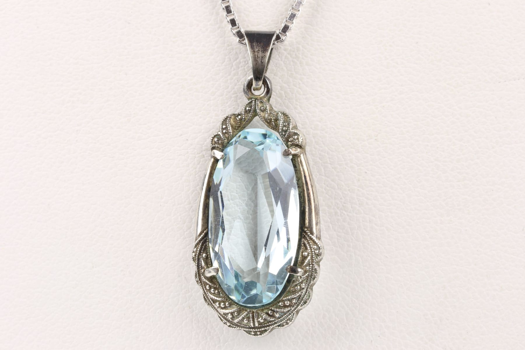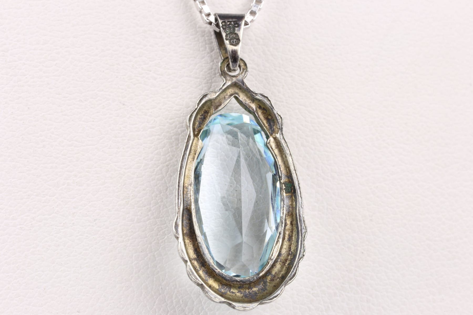 Bilder HÄNGE med ovalslipad ljusblå sten, möjligen glas, samt HALSKEDJA, venezia, silver