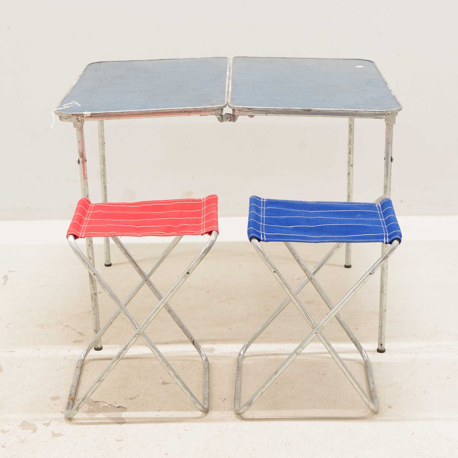 Bilder CAMPINGBORD med 2st pallar, hopvikbart, 1900 talets mitt. H:60x 60x 75cm (slitage)