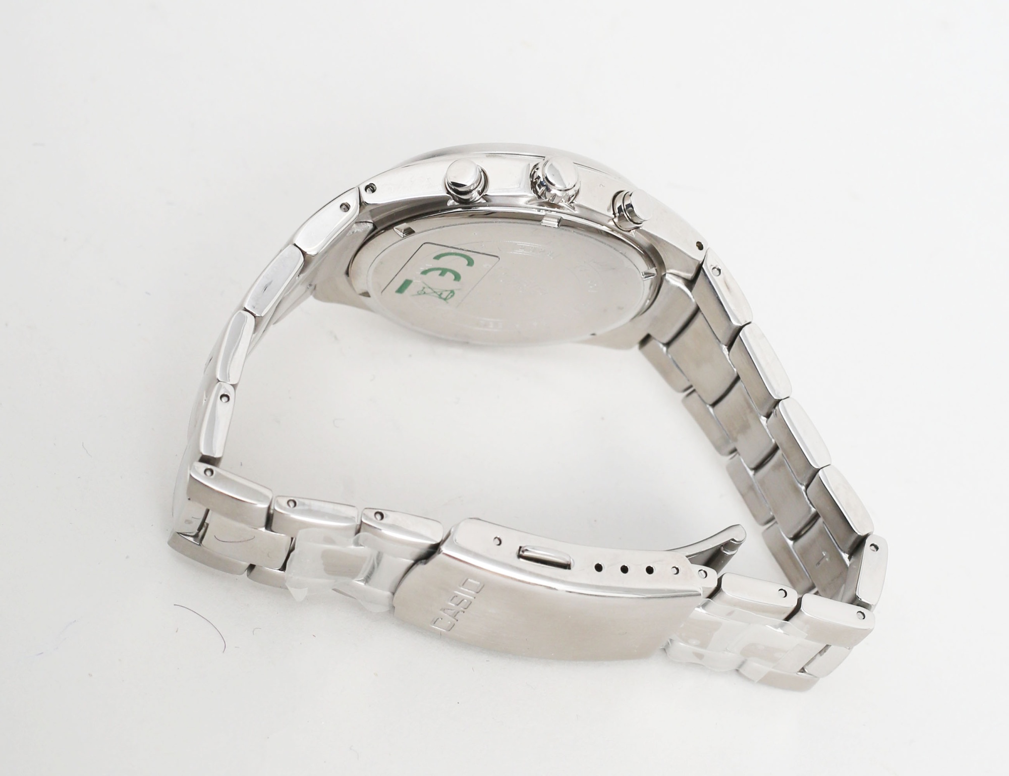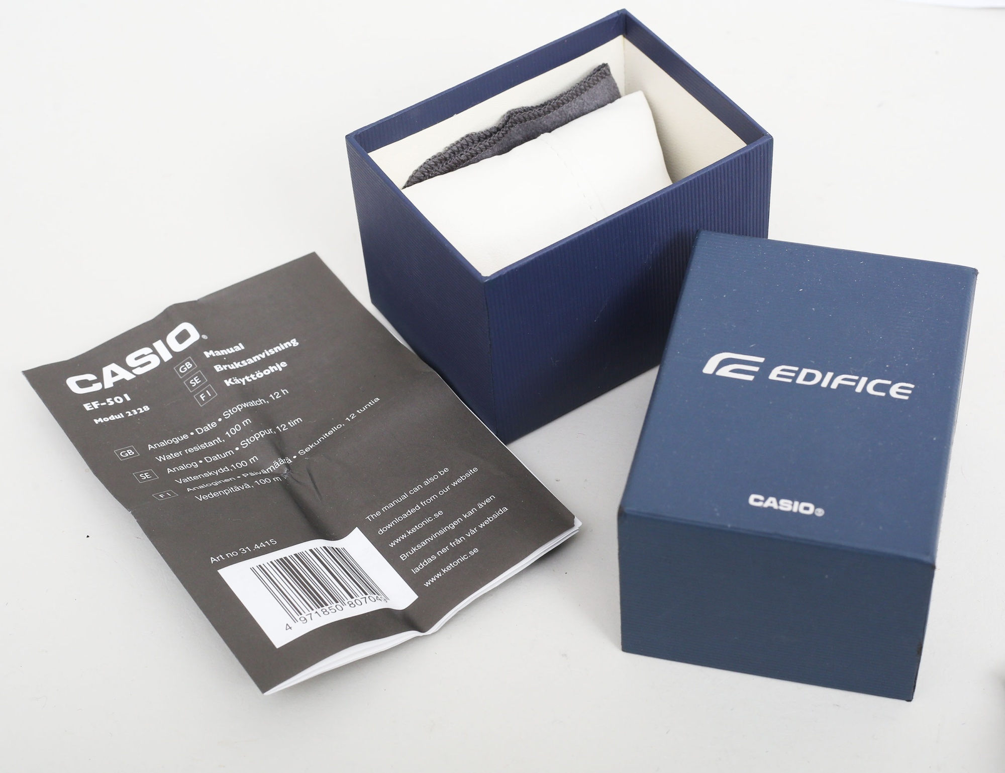 stål, cronograph, Casio EF-501, quartz, stållänk, originalbox samt bruksanvisning, nyskick, ej funktionstestad, diameter 40mm.