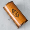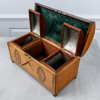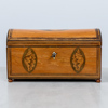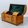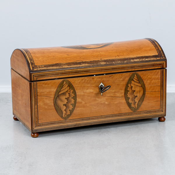 Intarsiadekor med snäckor. Invändigt med 2 blyklädda burkar. Nyckel finns.