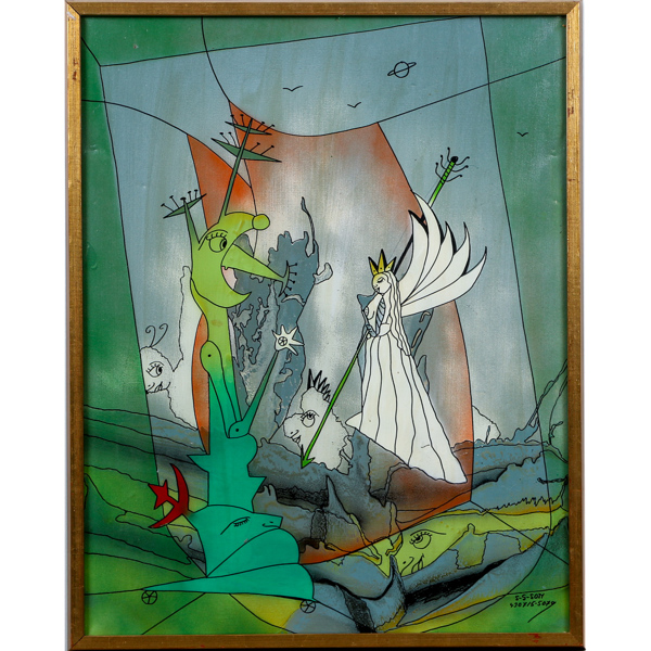 Bilder Sven-Göran Svensson "G-son", komposition med drake och prinsessa, olja på duk