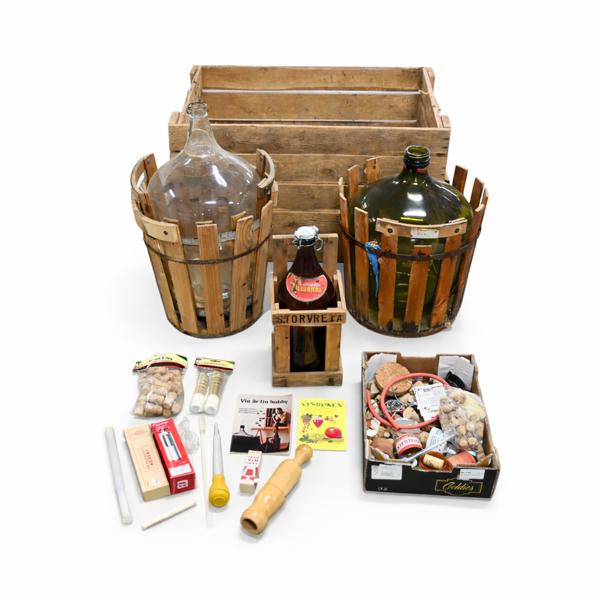 Bryggtillbehör, damejeanner, flaskor m.m.