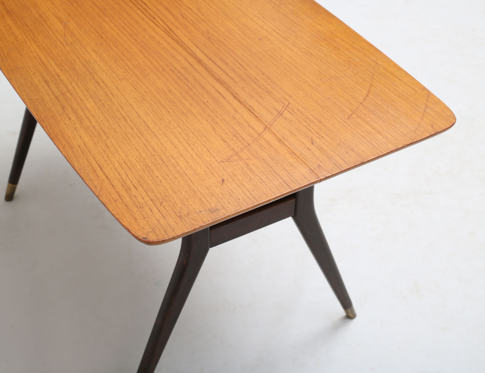 teak, fottrissor i mässing, kan höjas till matbord, tre iläggsskivor, höjd 60, längd 105, bredd 60 (+53, 16, 16)