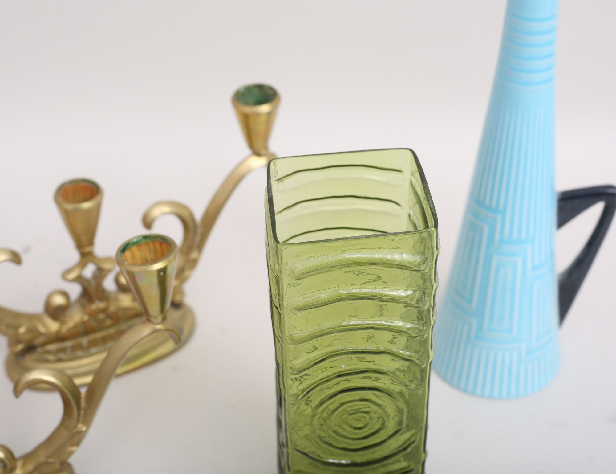 vas grönt glas Finland, höjd 25/18, 1 par kandelabrar för vardera tre ljus, 1930/40-tal, mässing, 23x14