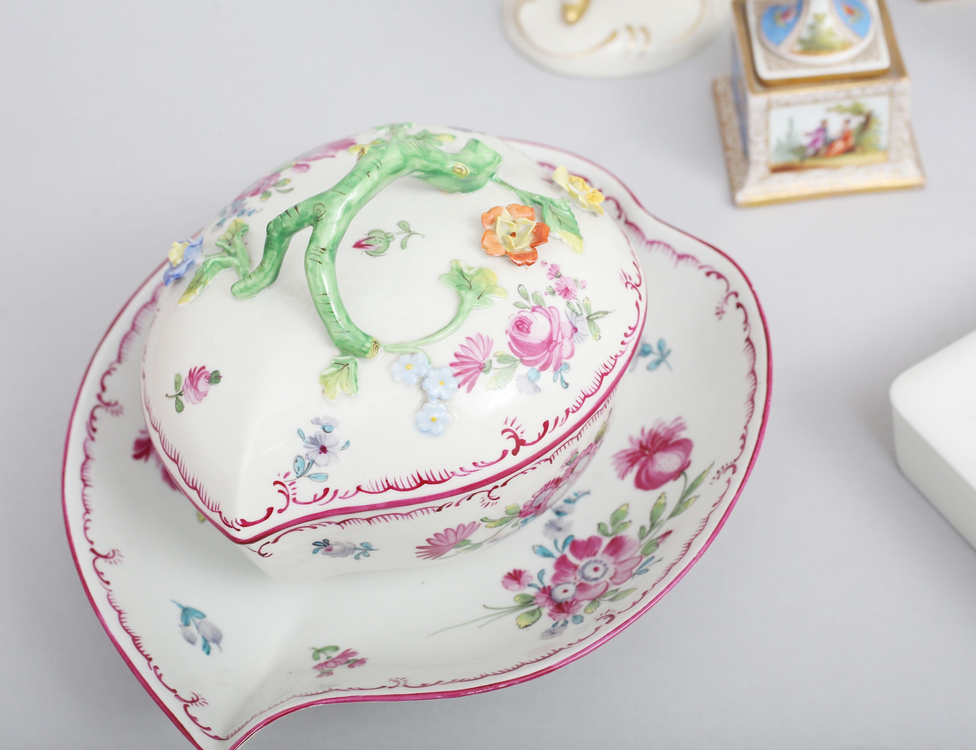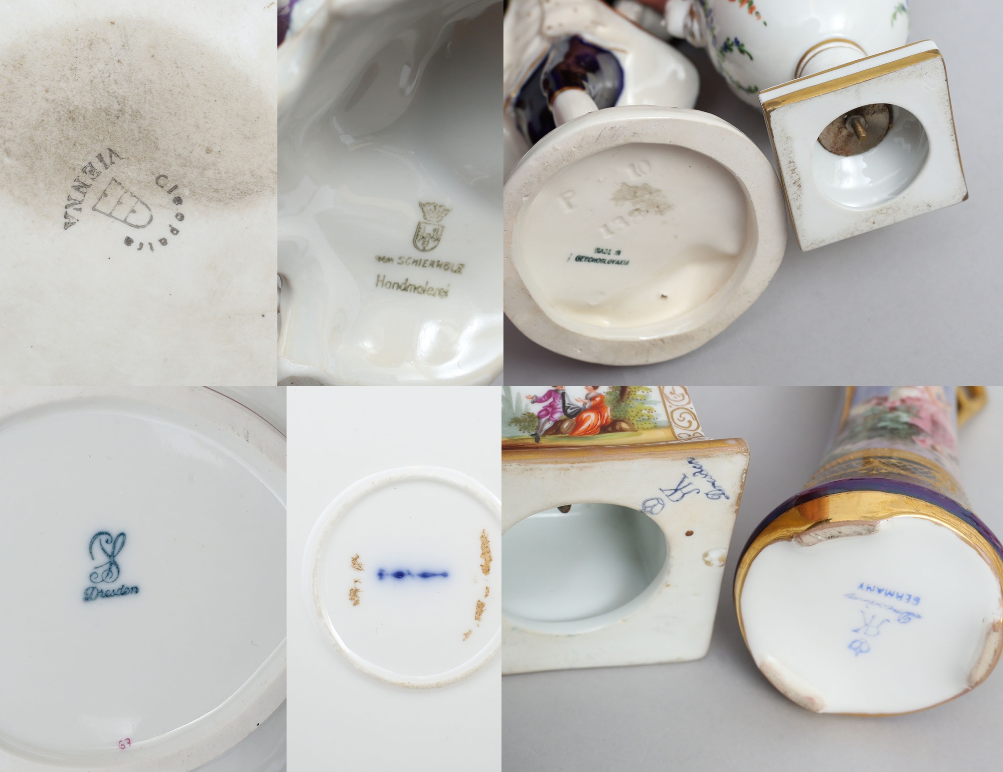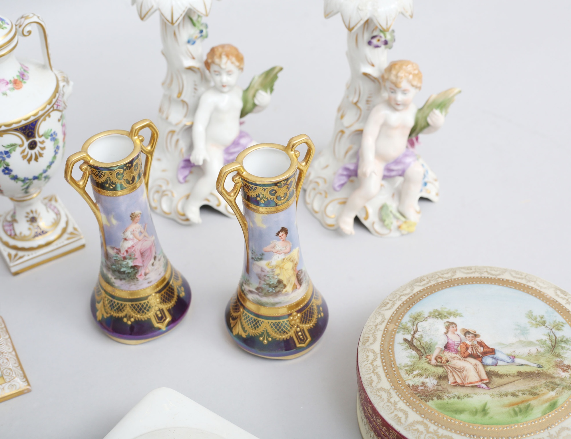 skål med lock samt fat rokokostil, höjd 13, bredd 22x19, urnor med lock 2 stycken, Dresden, höjd 16/18, 1 par ljusstakar höjd 19, 1 par vaser Tyskland höjd 13, dosa med lock Wien Österrike. diameter 13, figurin Tjeckoslovakien höjd 23, ask med lock Berlin, 11x11