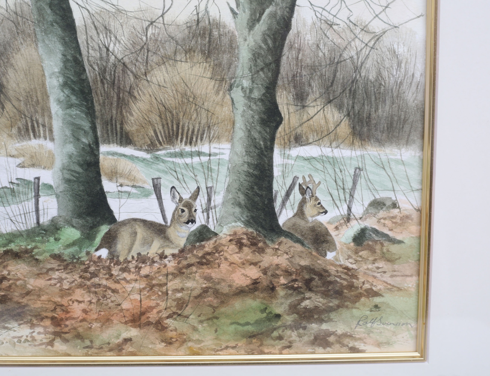 akvarell, vårvinter, motiv av bla två vilande rådjur, signerad, 29x46, rammått 50x66