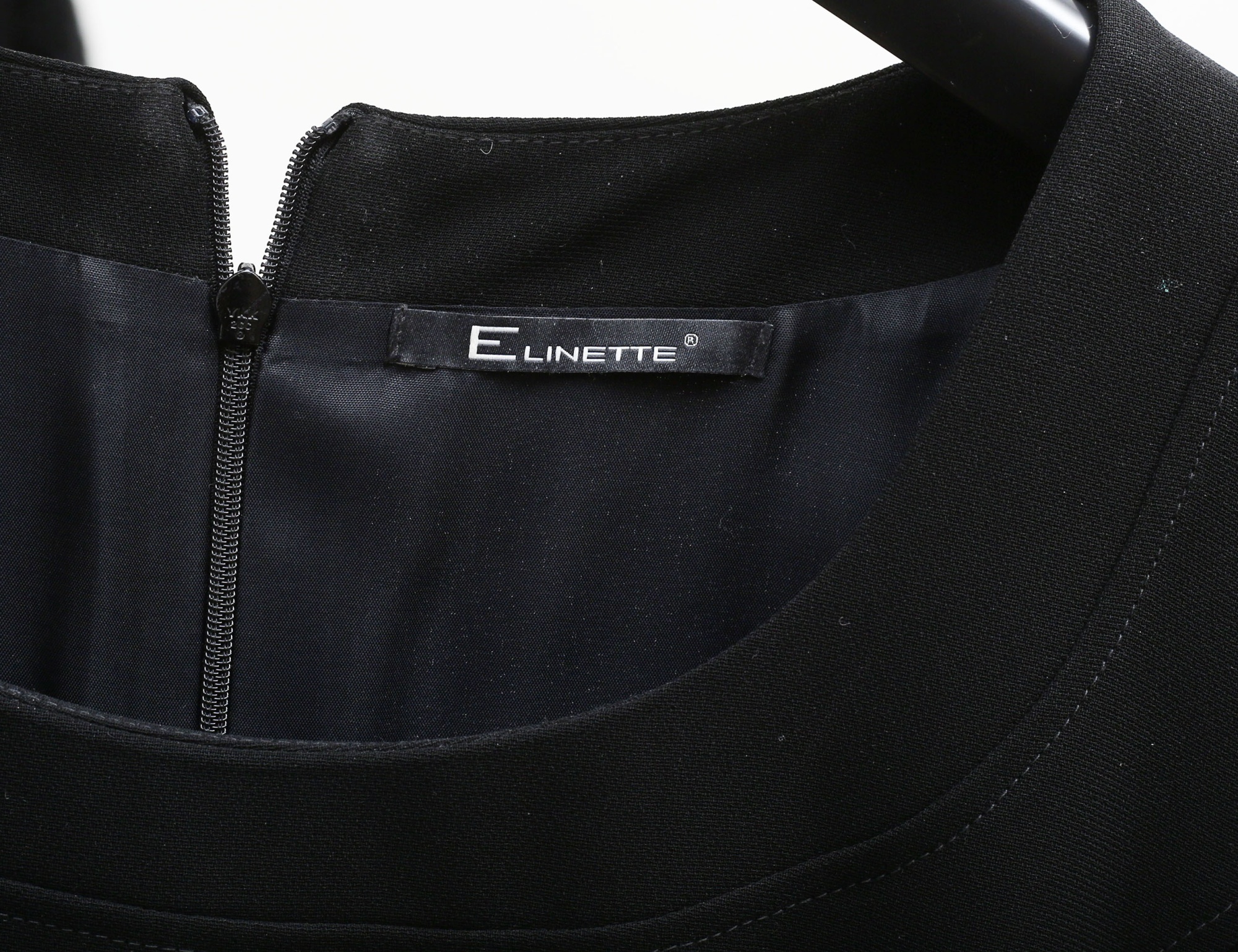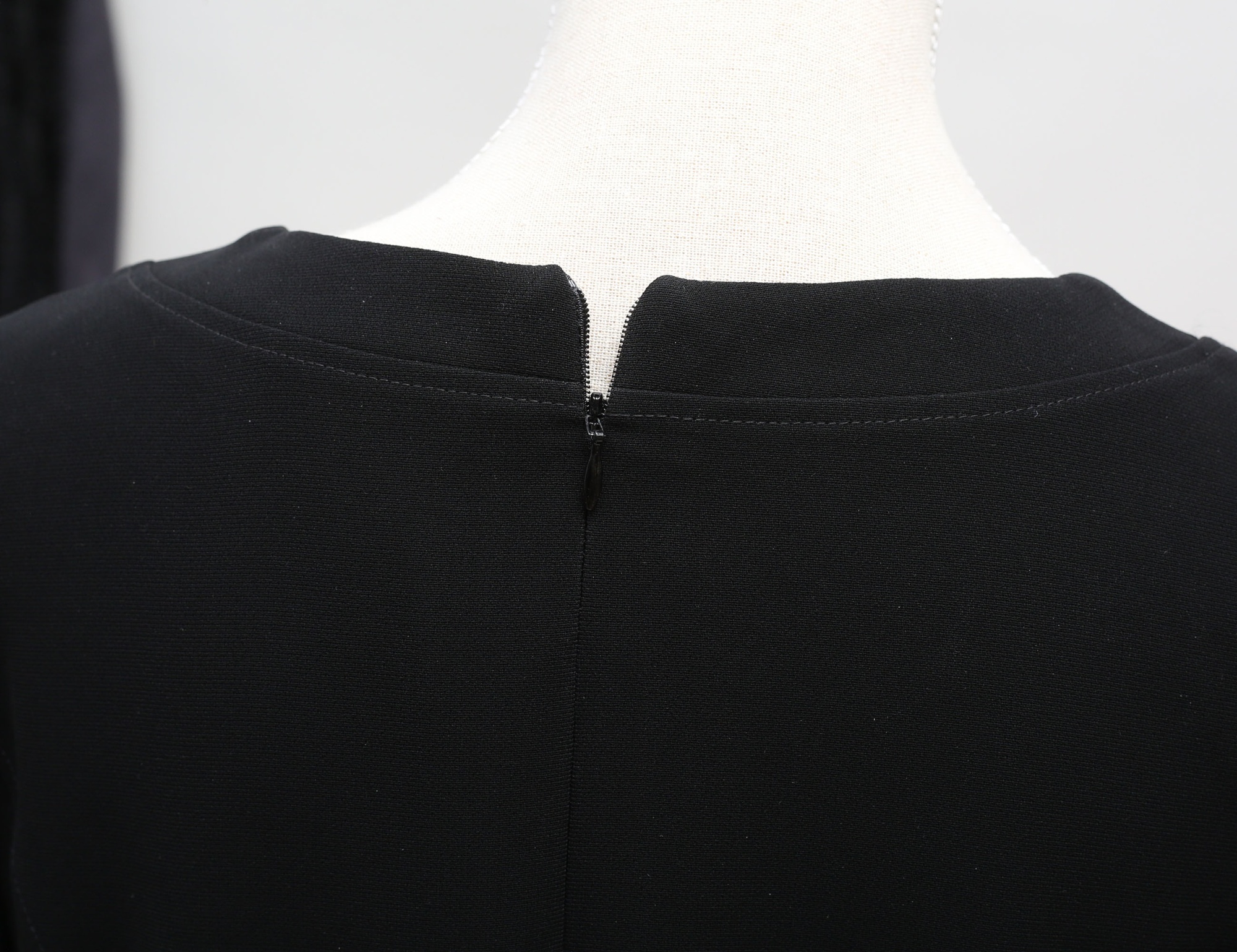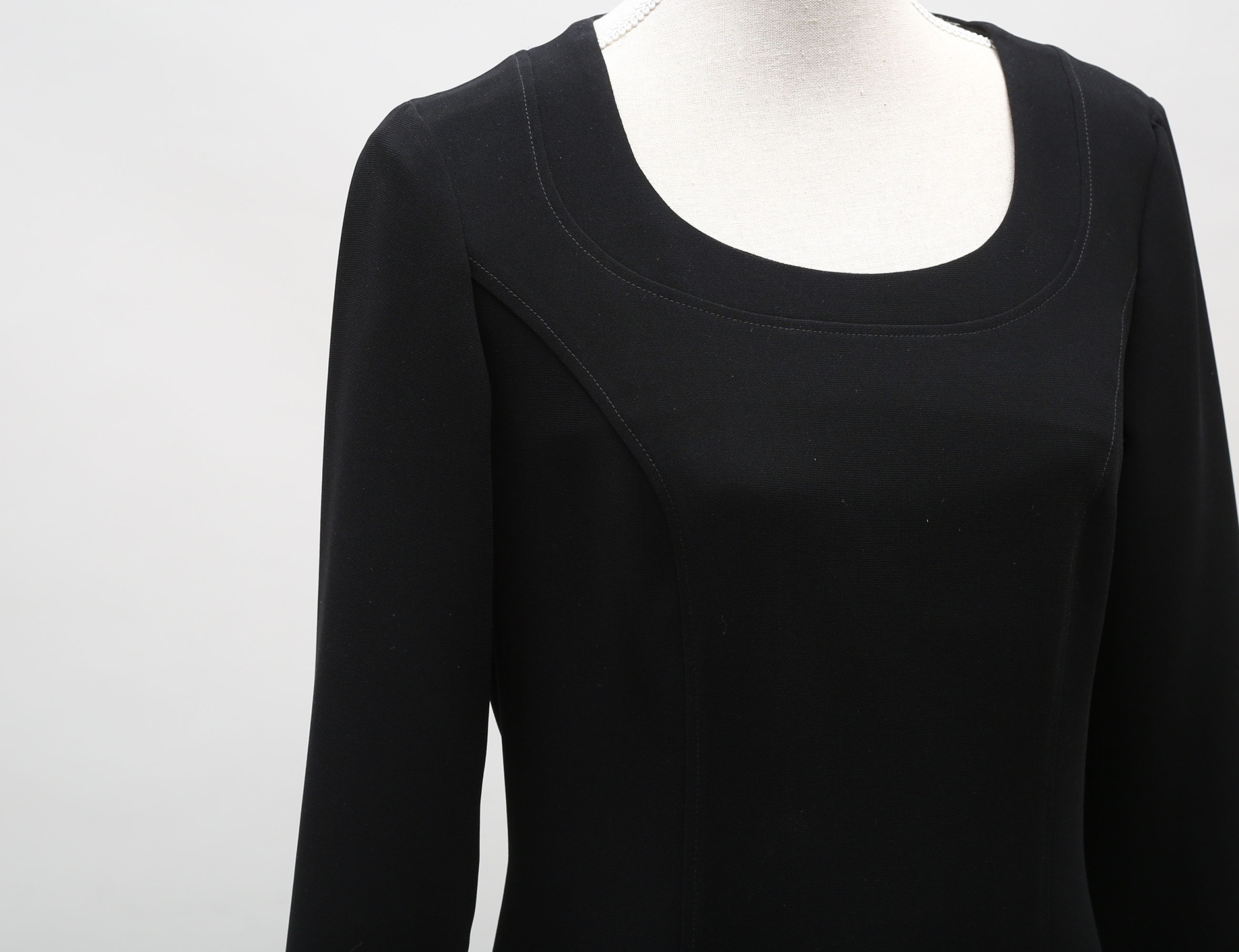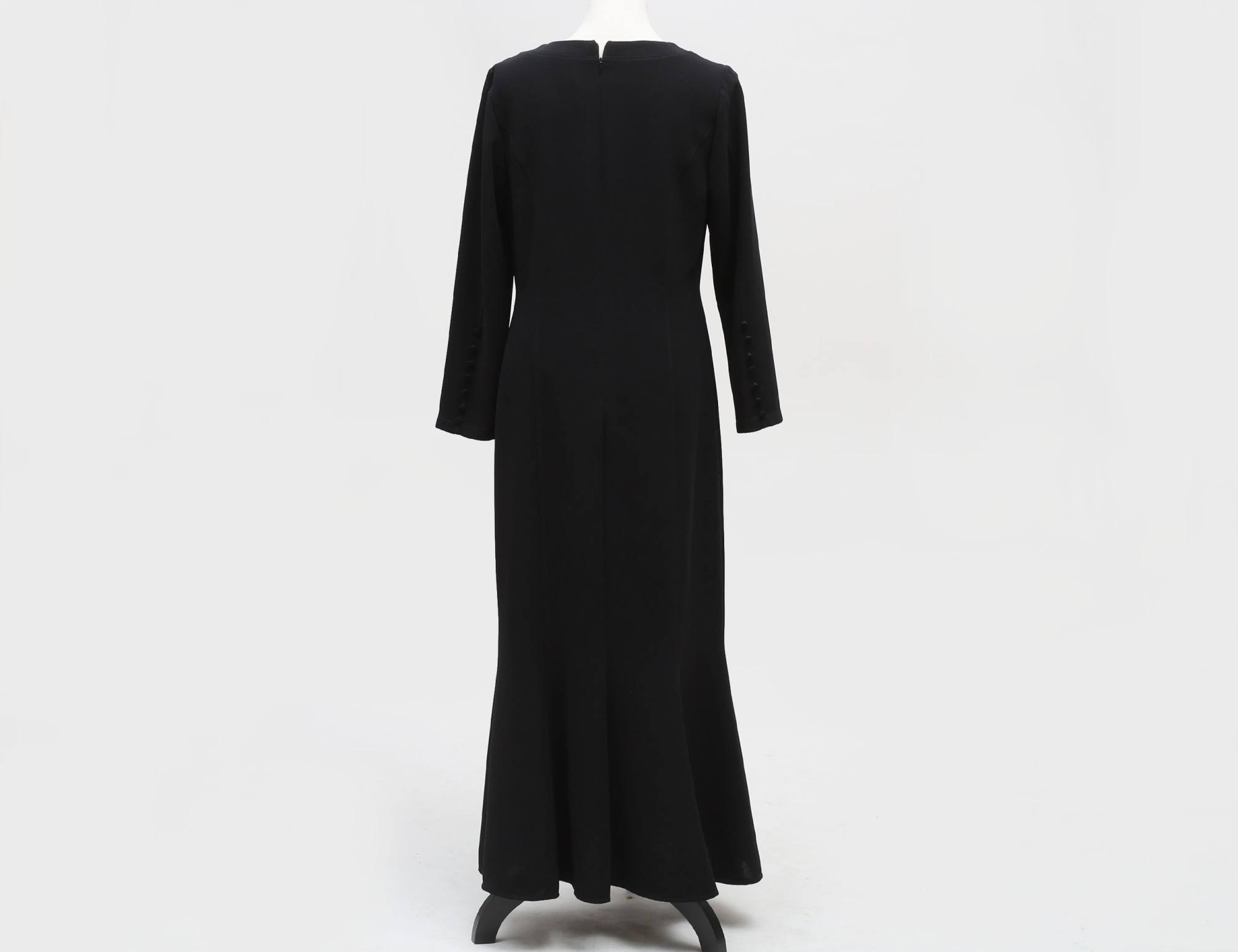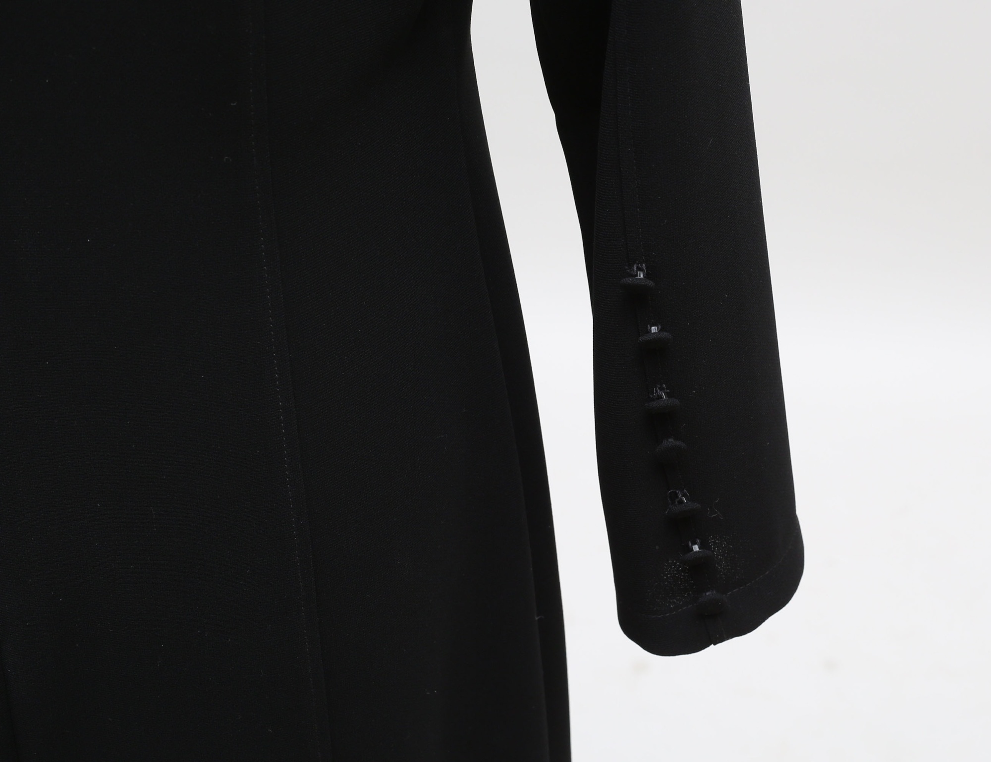 svart, helfodrad, 100% polyester, ärmarnas avslut med tygklädda knappar, klockat avslut, dragkedja i ryggen, gott skick, storlek 40, rygglängd 133