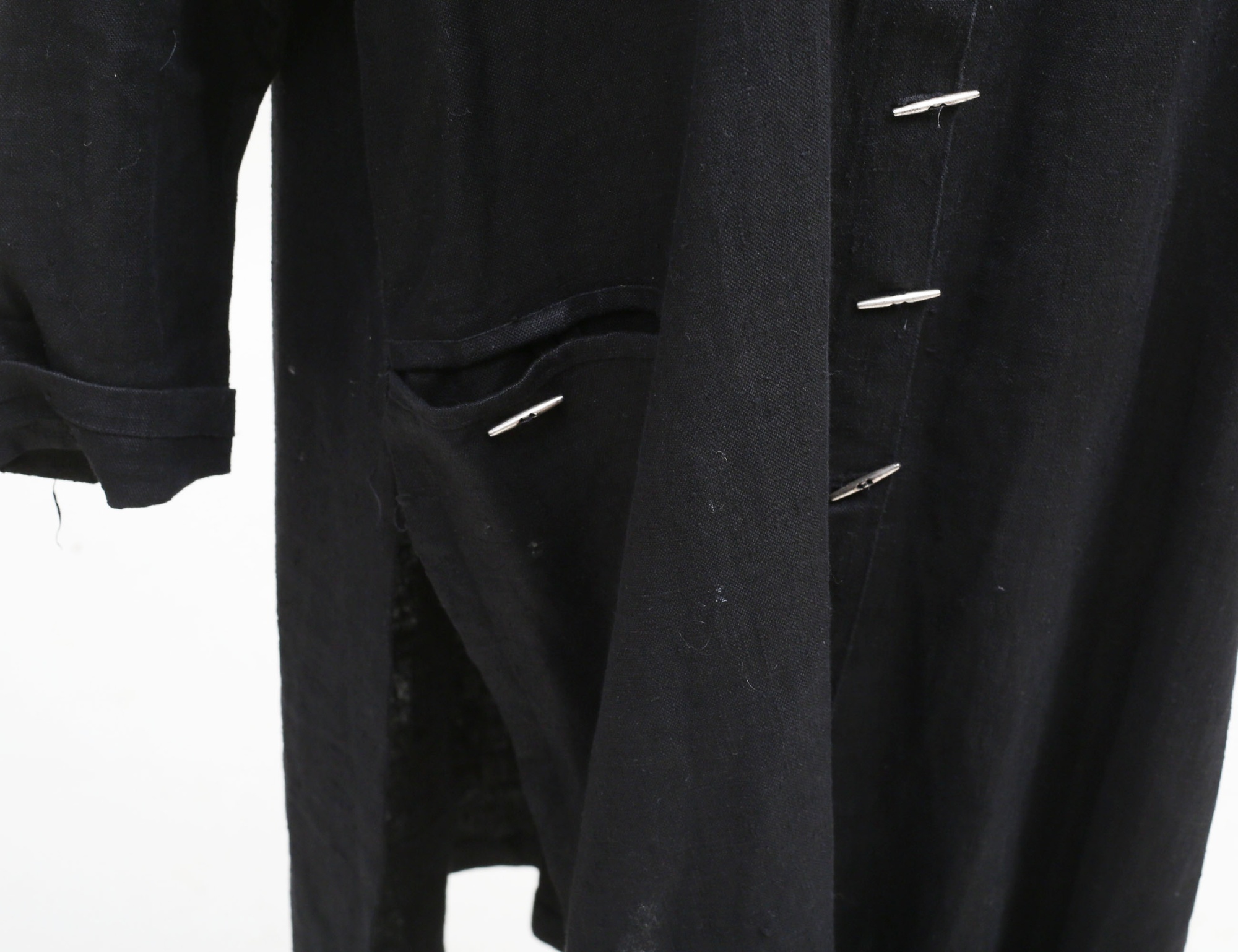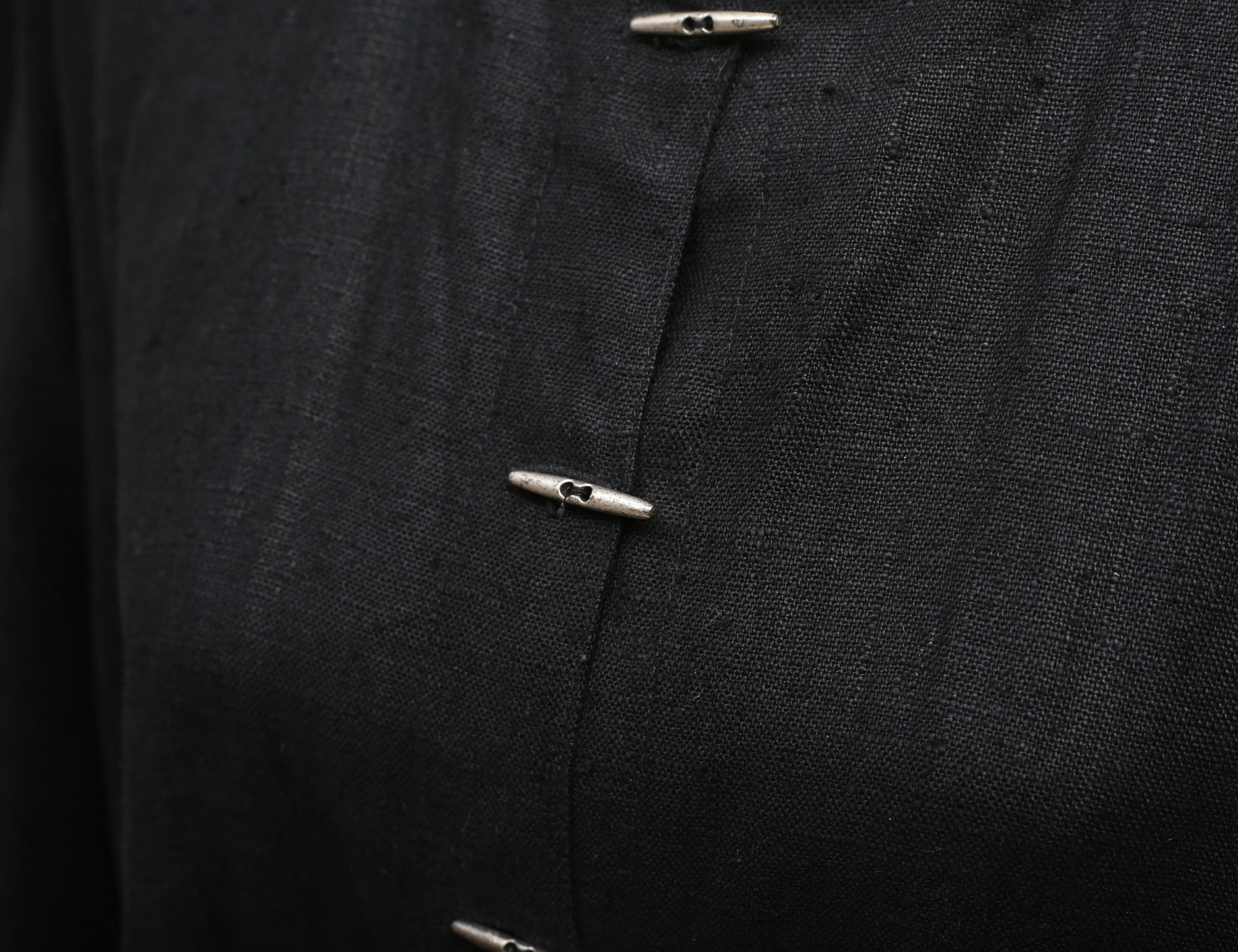100% linne, svart med avlånga knappar i metall, slits på sidorna, två fickor, gott skick, storlek L
