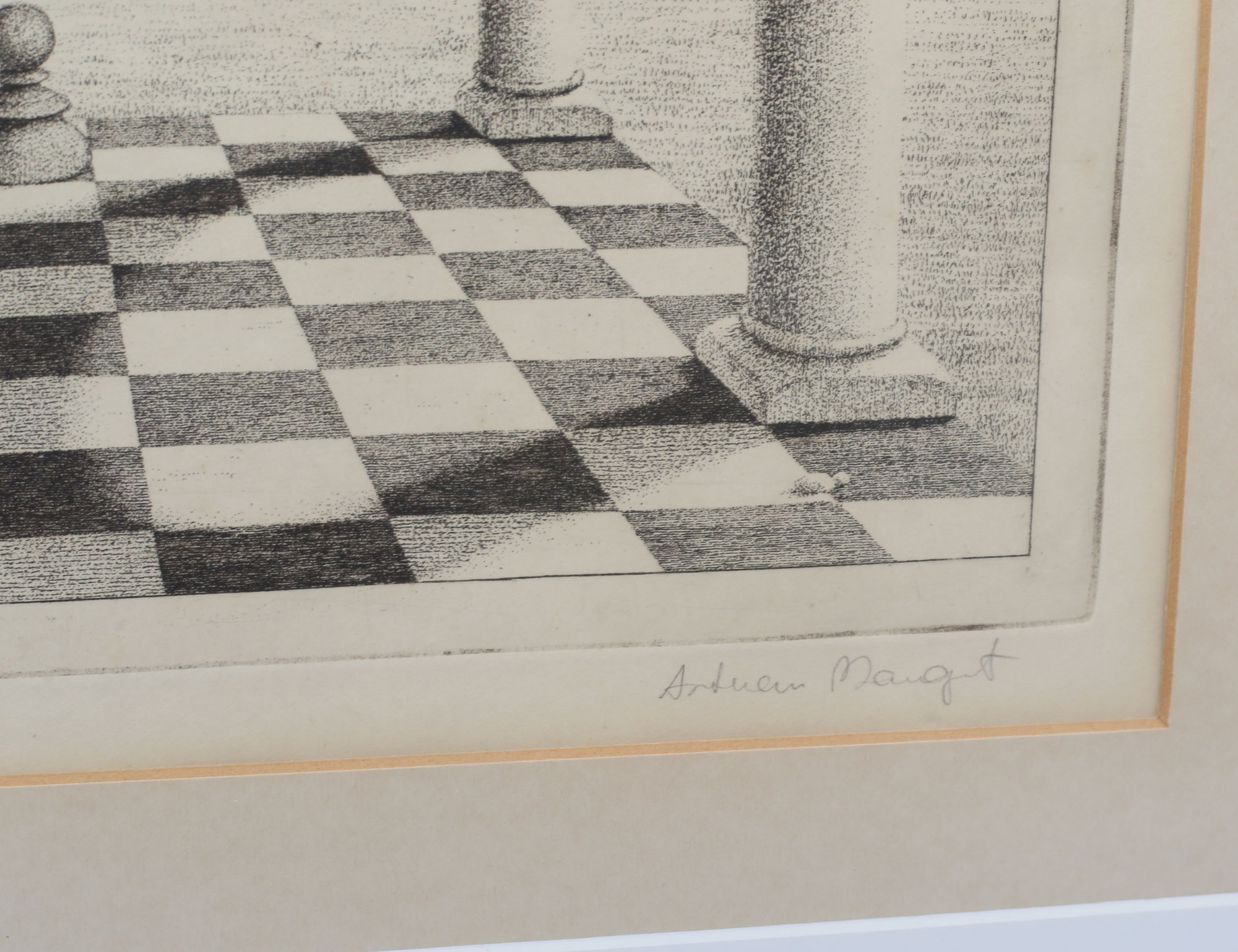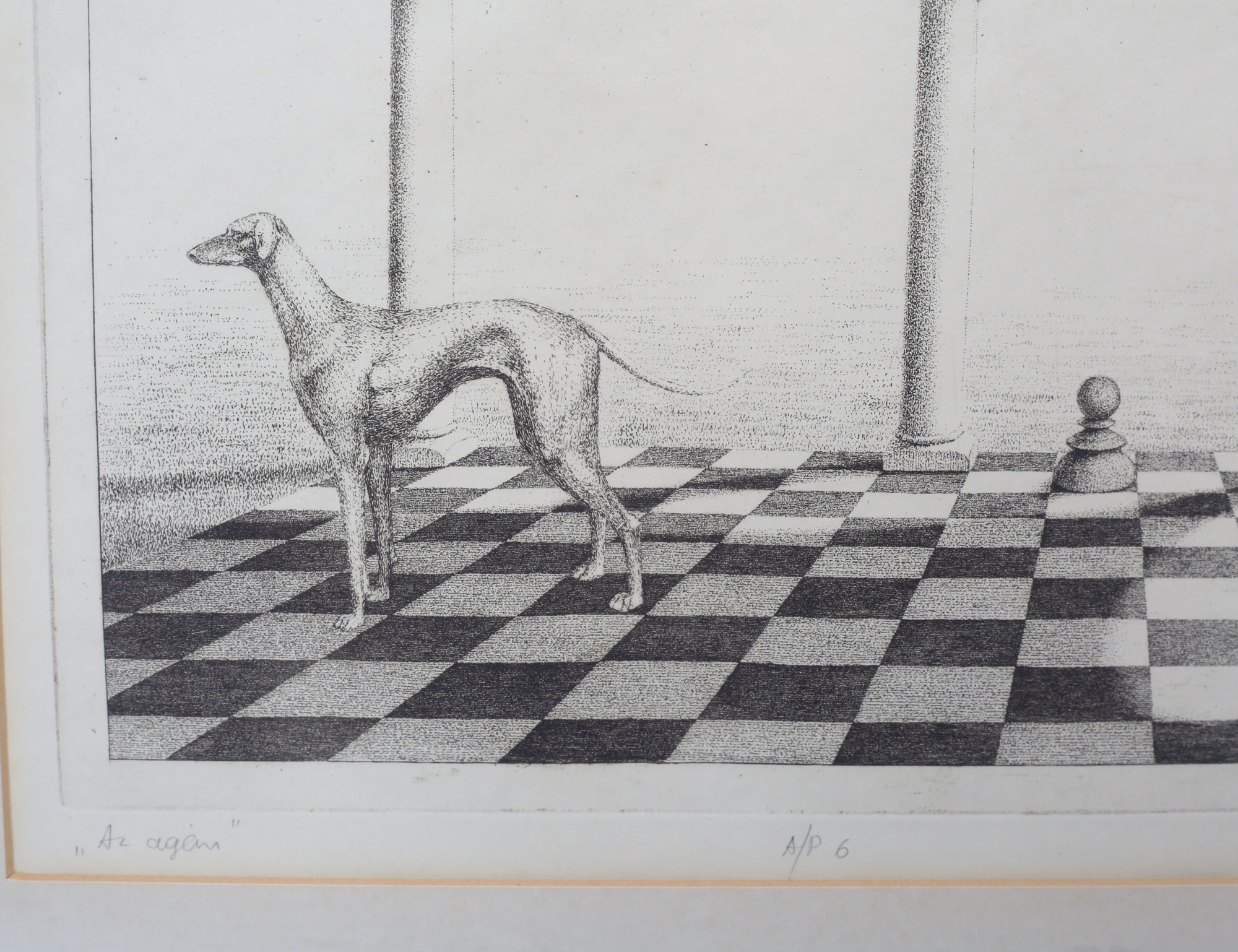 etsning A/P 6, vinthund i palatsinteriör, signerad, bildmått 27x36, rammått 54x74