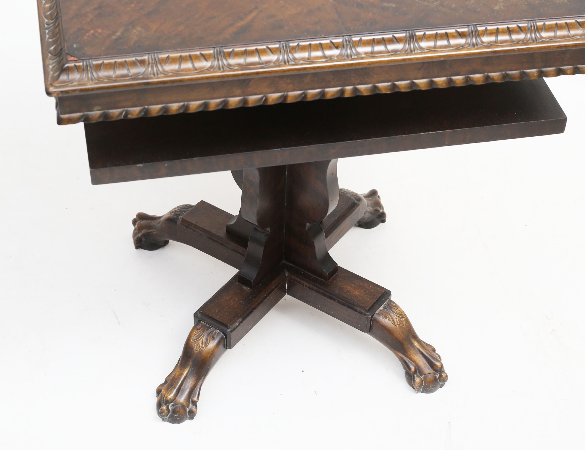 betsad björk, hylla under bordsskivan, fyrpassformad centralfot, lejontassar, höjd 67, bredd 60x60 (bruksslitage, fanerskada)