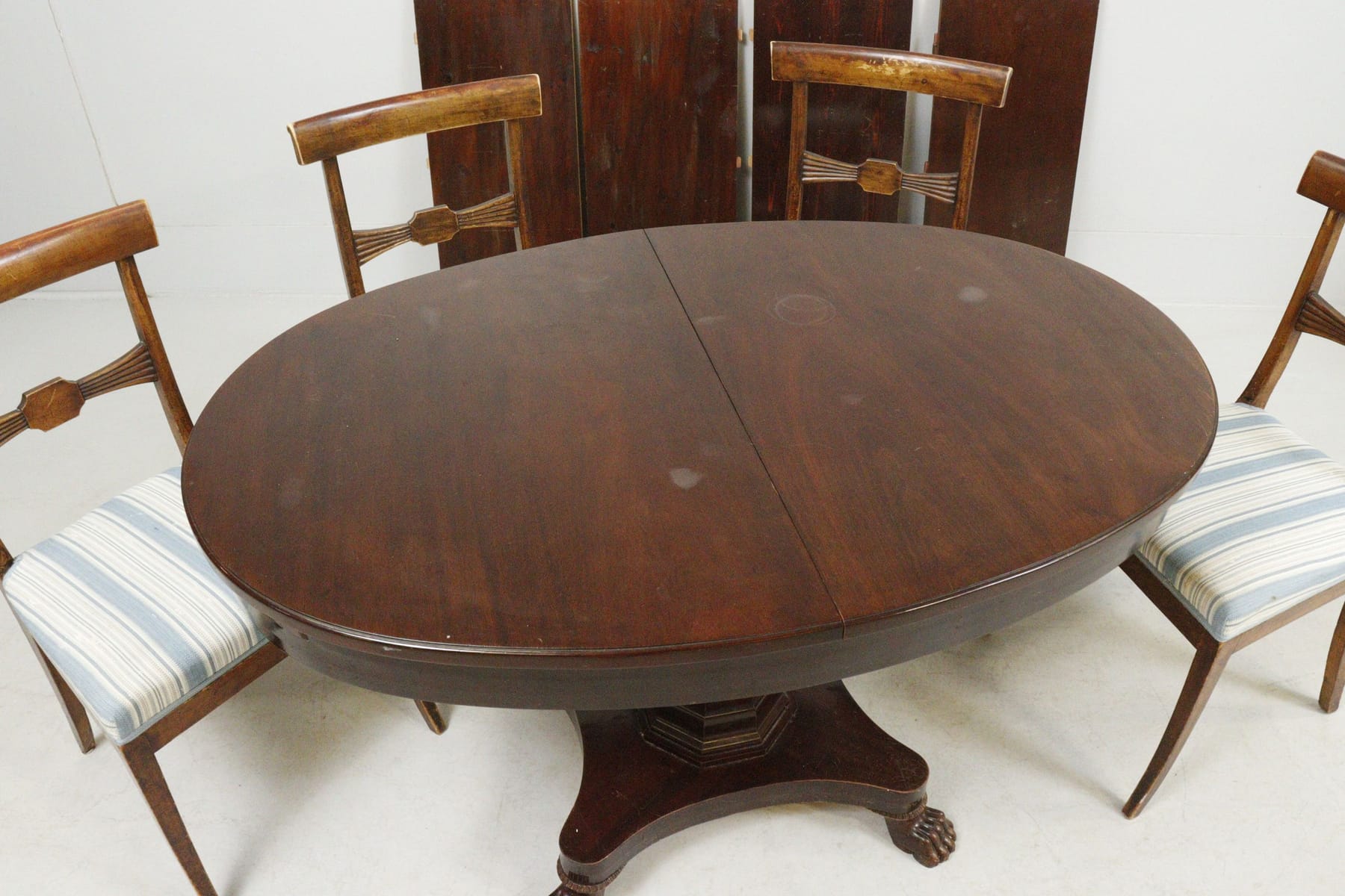 Pelarbord med 4 stolar och 4 iläggsskivor