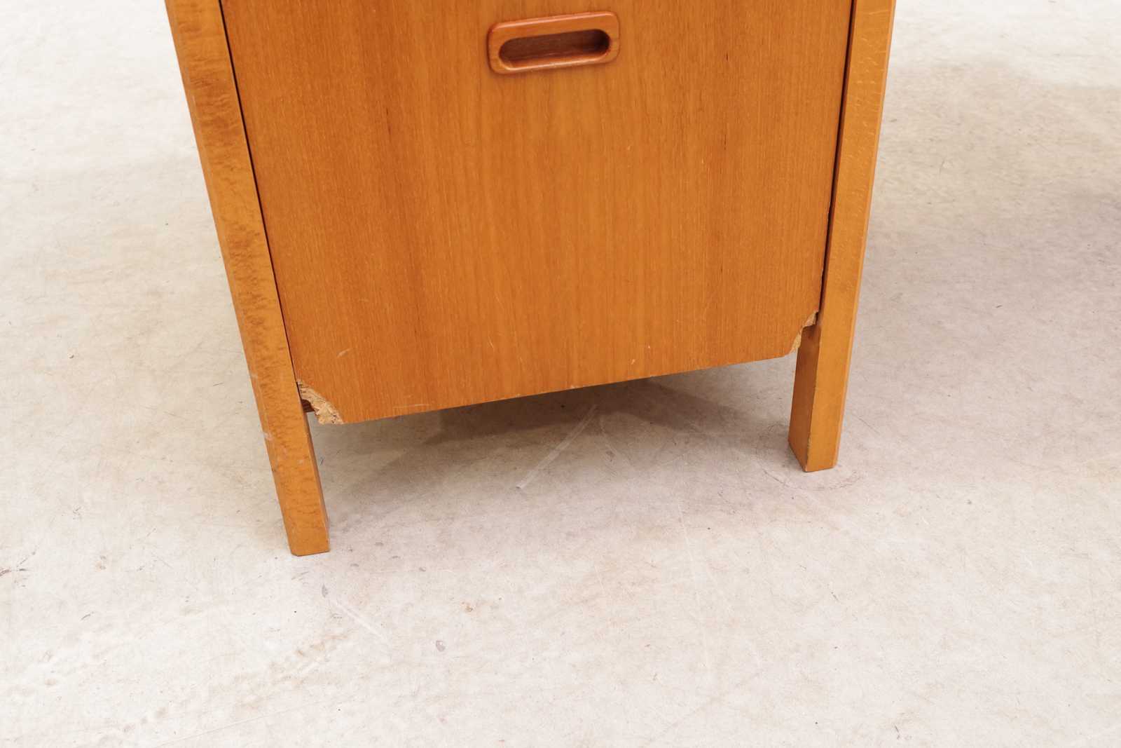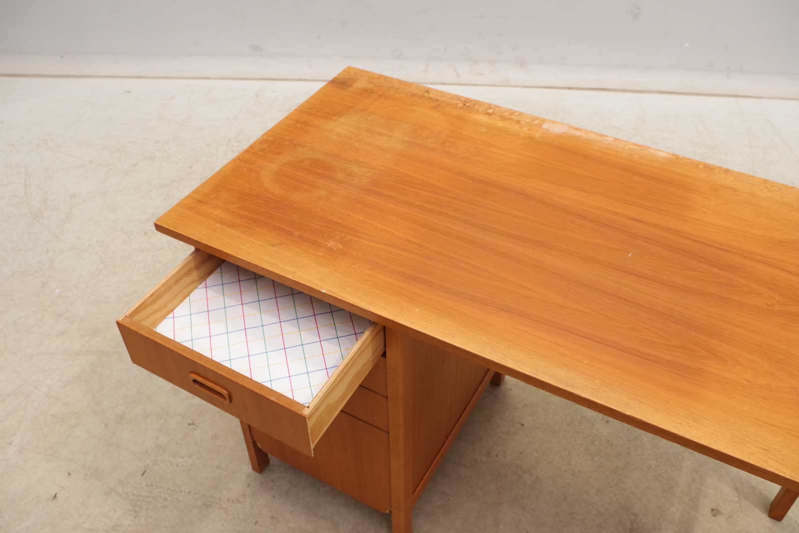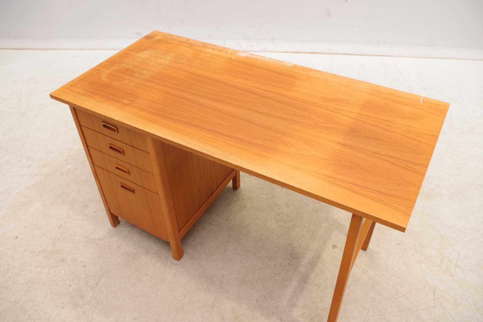 Bilder SKRIVBORD fanerat teak/bok, 1900-talets andra hälft. H:75x 125x 60cm. slitage, märken, rangligt.