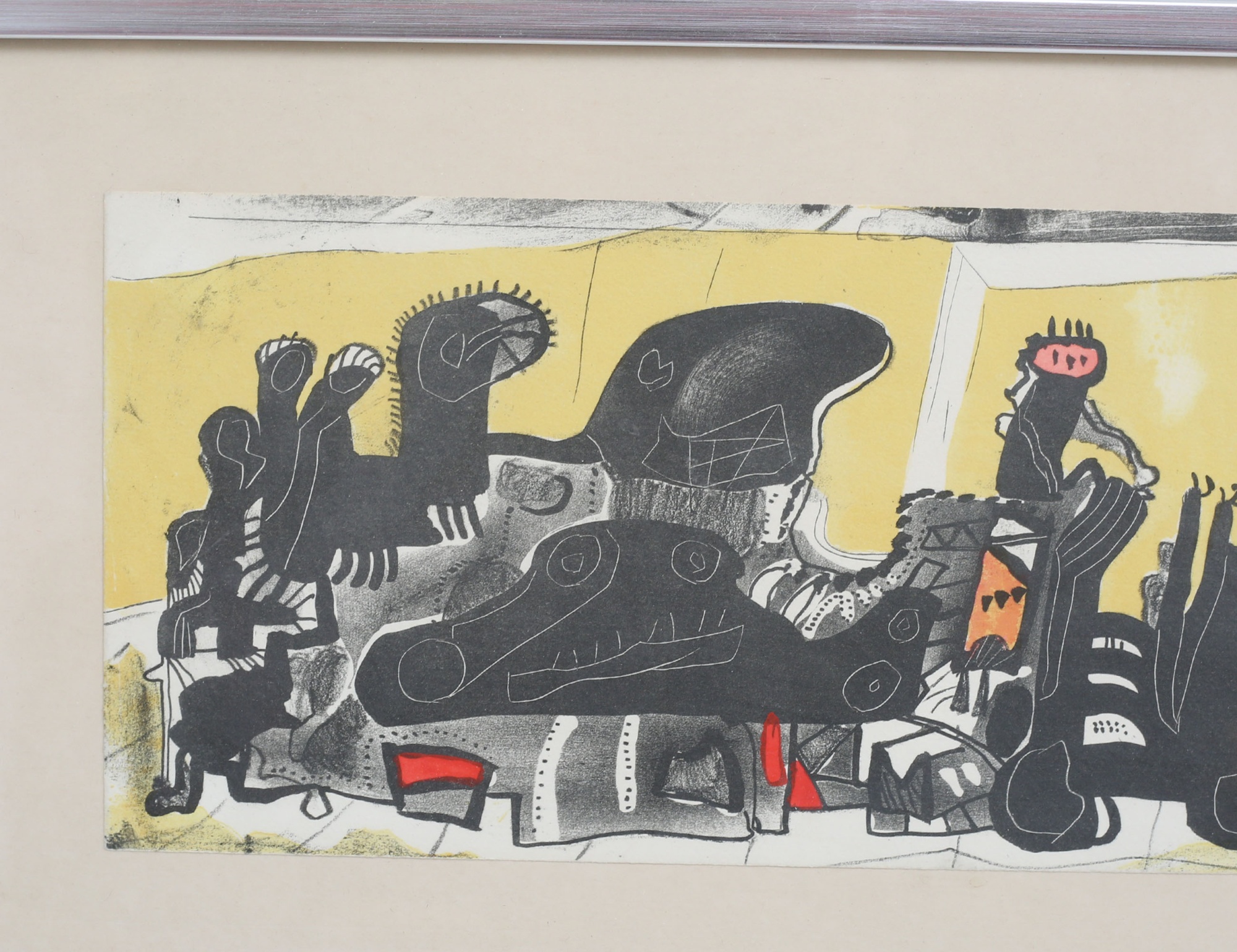 färglitografi "Tryckeriet", signerad, 16x69, rammått 26x80