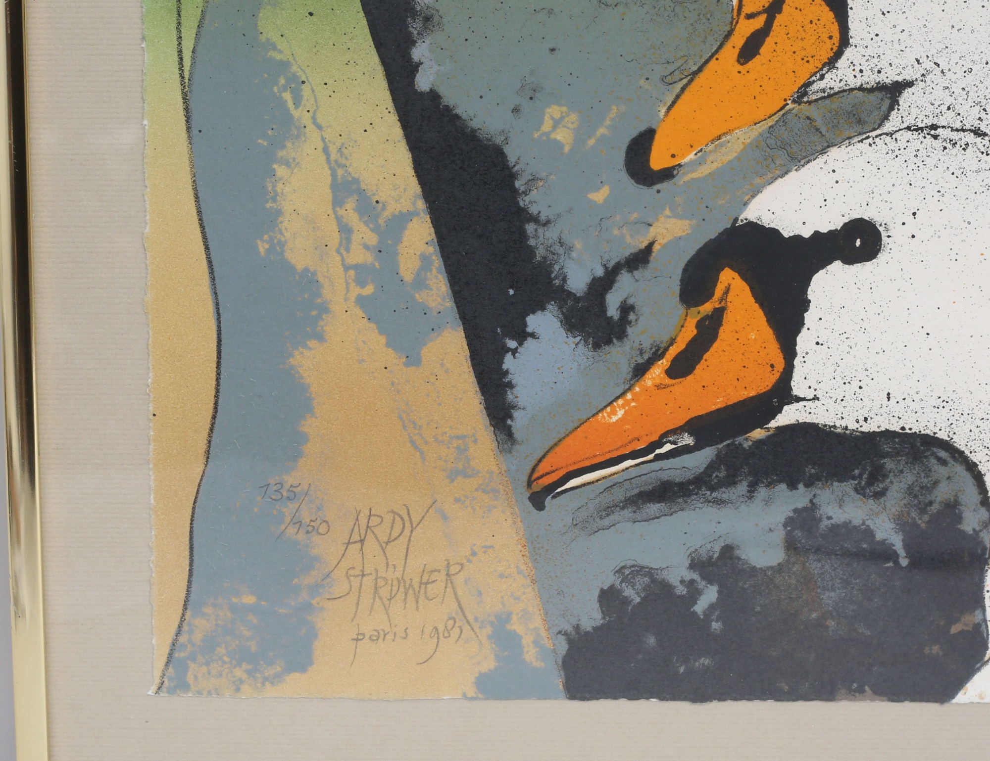 färglitografi 135/150, svanar och ros, signerad Paris 1985, 75x56, rammått 84x64