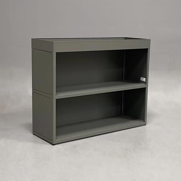 Hylla från HAY, modell New Order. Formgiven av Stefan Diez. Pulverlackerad aluminium i grå/grön kulör. Kan placeras fristående eller integreras i New Order-systemet.