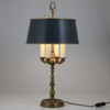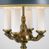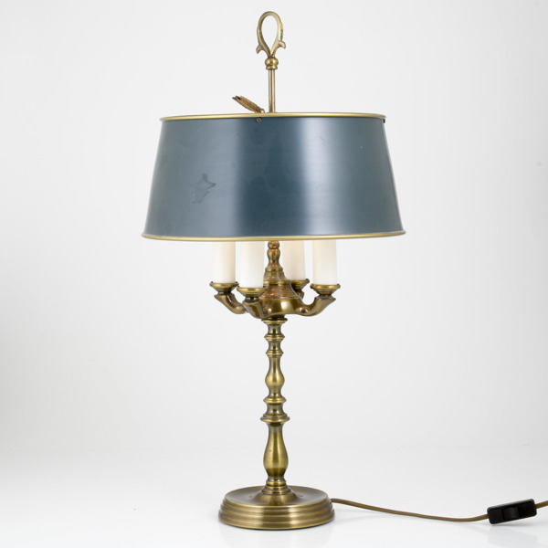 Einar Bäckströms metallvarufabrik, stomme i mässing, 4 ljuspunkter, grönlackerad skärm, numrerad undertill 5952, höjd 61 cm