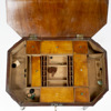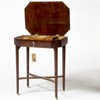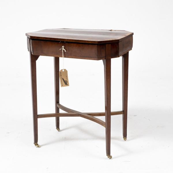 Fanerat i mahogny, på hjultrissor i porslin, höjd 72,5, 60,5 x 43,5 cm