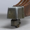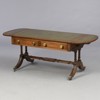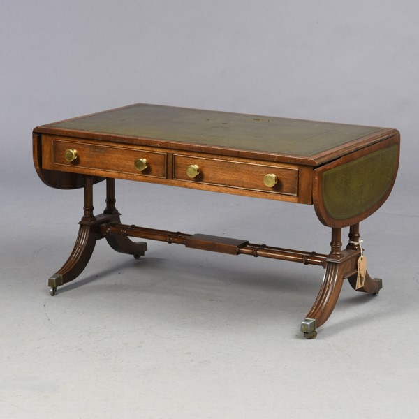 1900-tal, mahogny, läderklädd skiva, 2 lådor, beslag i mässing, fotavslut med hjultrissor, höjd 53, 102 x 61 cm, vardera klaff 23 cm