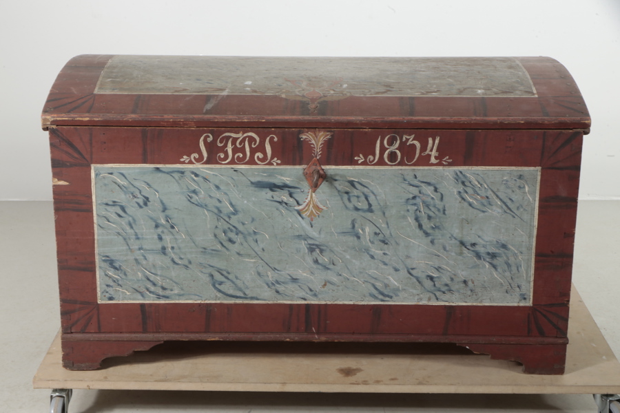 Proveniens: Erik Gustav Kring Å NorralaBär datering: 1834Originalmålning. Välvd lock. Marmoreringsmålning.Originallås. H= 60cm L= 108cm Djup= 60cm