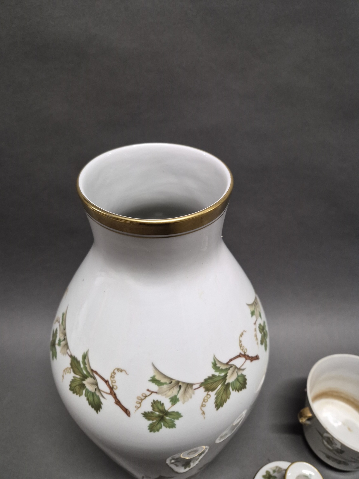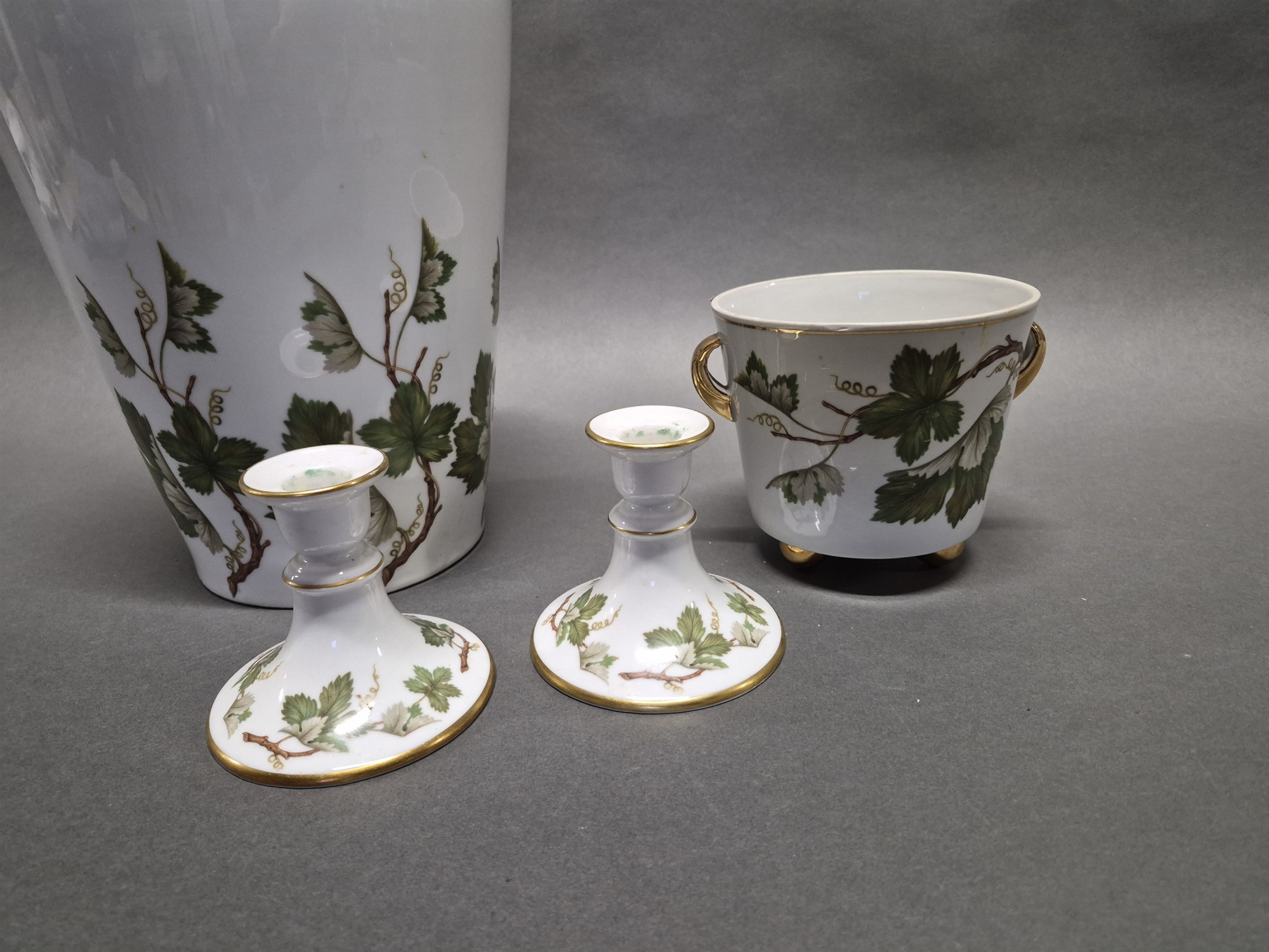 Porslin Hackefors "Vinranka" vas, ljusstakar 1 par och ytterfoder, högsta höjd 46 cm