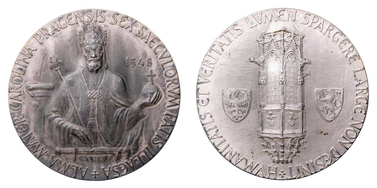 Tjeckien. Universitetet i Prag 600 år. Tjeckien. Till minne av 600-årsdagen av grundandet av Karl IV universitet i Prag 1348-1948. Åtsidans omskrift: ALMA MATER CAROLINA PRAGENSIS SEX SAECVLORVM FATIS ILLAESA. Av O. Spaniel. Silver. I etui. Ex finsk statsman.