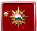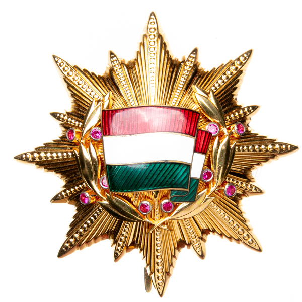 Folkrepubliken Ungerns flaggorden (Order Of The Flag Of The Hungarian People's Republic, I Class With Rubies). 1. klass. Förgylld. Ungerns flagga emaljerad inom en rubinprydd lagerkrans. Rubinerna syntetiska. 80 mm. I presentetui. Miniatyr medföljer. Folkrepubliken Ungerns flaggorden var en statlig utmärkelse som instiftades 1956 och tilldelades för exceptionella tjänster till Ungern inom fredsbyggande, statsutveckling och internationella relationer. Variationer som diamanter, rubiner och lagerkransar lades till i klasserna 1976, och avskaffades 1991, efter slutet av kommuniststyret. Ex finsk statsman.