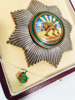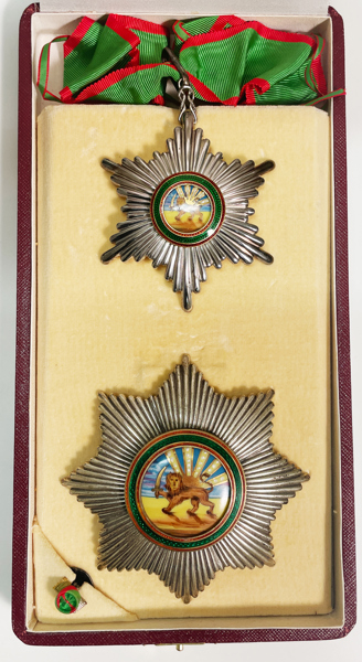 Persiens (Iran) Lejon-och Solorden (The imperial order of the Lion and the Sun). Halskors, kraschan och rosett. I originaletui från Arthus Bertrand Paris, vars namn också är stämplat på halskorset. Lejon- och solorden (The imperial order of the Lion and the Sun) var en persisk orden instiftad 1808 av Qajar-dynastin, använd för att belöna utländska tjänstemän för framstående tjänster för Persien (nuvarande Iran). Motivet baserades på den uråldriga persiska nationalsymbolen lejonet och solen. Orden användes fram till revolutionen 1979. Medföljer också visitkort från A. Danaï (Irans ambassadör i Stockholm) och A. Zahedi (Irans utrikesminister). Ex finsk statsman.