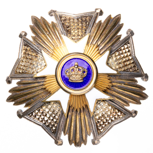Belgien. Kronorden (The order of the Crown). Storofficerskraschan, delvis förgylld och emaljerad. Av P. de Greef. I etui. Kronordens Storkors (Belgien) är den högsta klassen av denna nationella orden, som tilldelas för framstående tjänster för den belgiska staten inom områden som industri, vetenskap, konst eller militär. Det bärs vanligtvis med ett skärp över höger axel och en stjärna på vänster bröst, vilket erkänner exceptionella prestationer och används ofta i diplomatiska sammanhang och representerar en av Belgiens viktigaste utmärkelser. Ex finsk statsman.