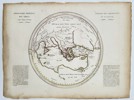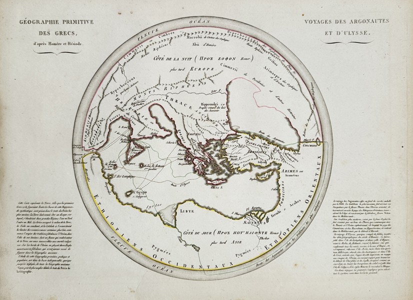 This hand-colored engraving depicts a circular map representing the primitive geographical worldview of the ancient Greeks according to the works of Homer and Hesiod. The map places Greece and the Mediterranean at the center, surrounded by the lands of the Ethiopians, Pygmies, and various mythological regions, all enclosed by the great "River Ocean". This work was published as part of the Atlas Complet du Précis de la Géographie Universelle, a significant project intended to document the history of human geographical understanding. The accompanying French text provides a scholarly analysis of ancient voyages, including those of the Argonauts and Ulysses, serving as an educational resource for nineteenth-century readers to explore the intersection of classical mythology and early cartography.