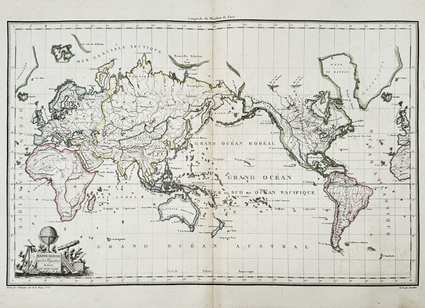 This hand-colored engraving features a world map presented on a Mercator projection, showing the continents and major oceans with detailed coastlines and interior geographical features known at the beginning of the nineteenth century. The map highlights various exploration routes across the Pacific and Atlantic, reflecting the contemporary scientific efforts to chart the globe with increasing precision. This work was published as part of the Atlas Complet du Précis de la Géographie Universelle, a monumental publication designed to provide a systematic visual account of global geography and the progress of maritime discovery. The plate includes an elaborate decorative title cartouche in the lower-left corner featuring scientific instruments such as a globe, telescope, and quadrant, emphasizing the intersection of geography, astronomy, and navigation during the Napoleonic era.